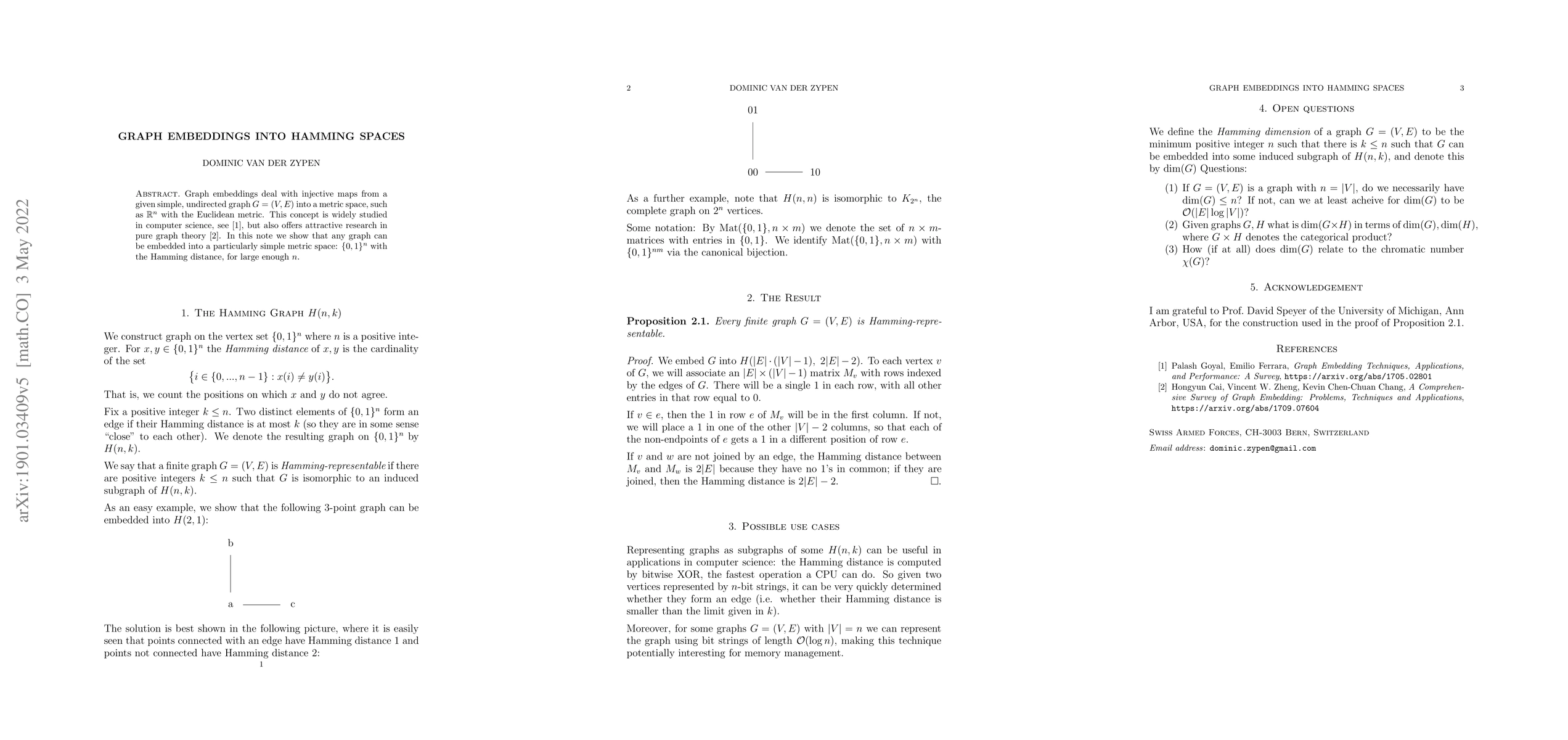 This work introduces a novel perspective on graph embeddings by demonstrating that any graph can be embedded into a simple Hamming space, offering potential advantages in terms of computational efficiency for certain graph operations.