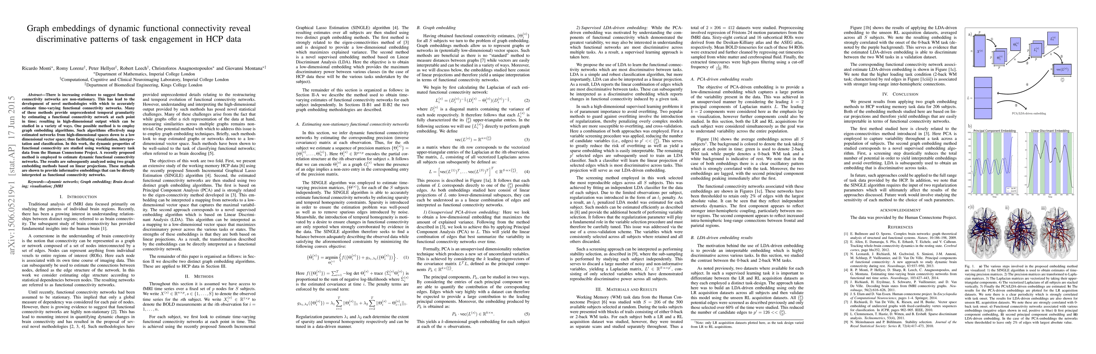 This paper investigates dynamic functional connectivity networks using working memory task data from the Human Connectome Project, employing graph embedding techniques to map high-dimensional time-varying networks into low-dimensional vectors for visualization and classification. The study demonstrates that these embeddings reveal discriminative patterns associated with task engagement.