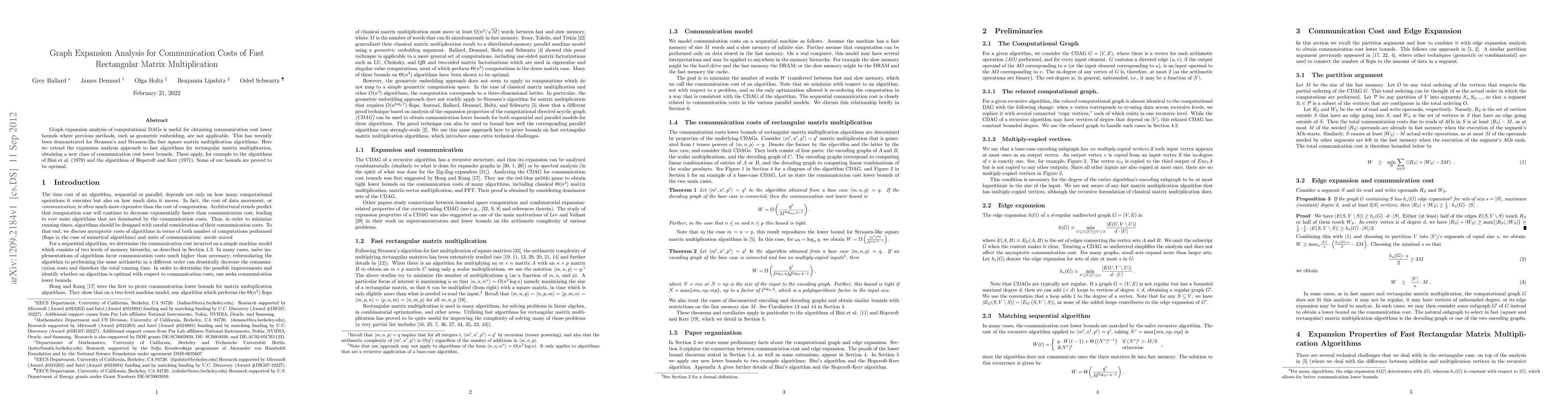 This paper extends graph expansion analysis to derive new communication cost lower bounds for fast rectangular matrix multiplication algorithms, applying to methods like those of Bini et al. (1979) and Hopcroft and Kerr (1971), with some bounds proven to be optimal.
