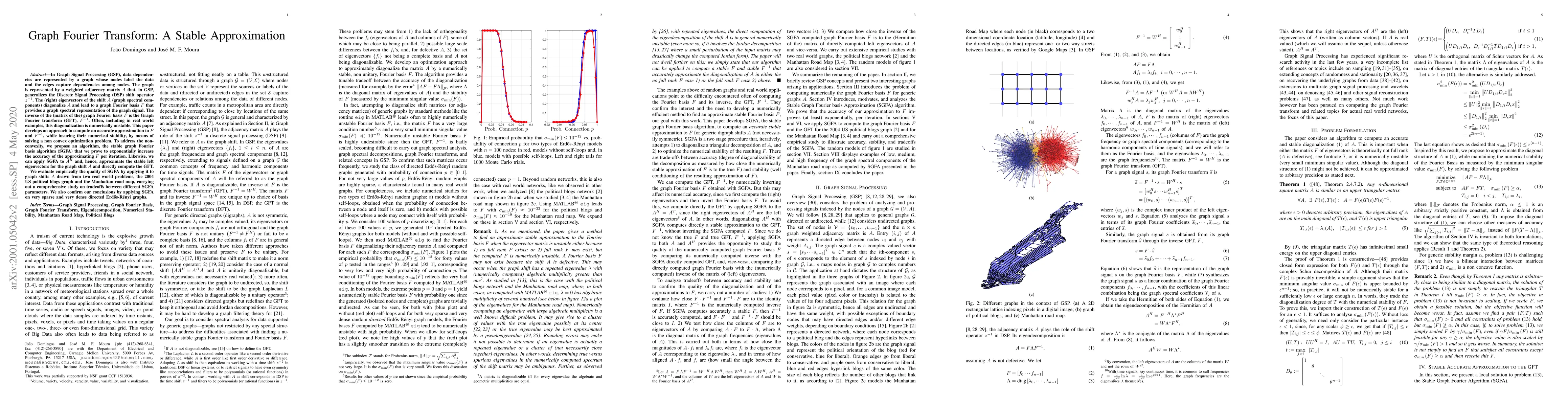 In Graph Signal Processing (GSP), data dependencies are represented by a graph whose nodes label the data and the edges capture dependencies among nodes. The graph is represented by a weighted adjacency matrix $A$ that, in GSP, generalizes the Discrete Signal Processing (DSP) shift operator $z^{-1}$. The (right) eigenvectors of the shift $A$ (graph spectral components) diagonalize $A$ and lead to a graph Fourier basis $F$ that provides a graph spectral representation of the graph signal. The inverse of the (matrix of the) graph Fourier basis $F$ is the Graph Fourier transform (GFT), $F^{-1}$. Often, including in real world examples, this diagonalization is numerically unstable. This paper develops an approach to compute an accurate approximation to $F$ and $F^{-1}$, while insuring their numerical stability, by means of solving a non convex optimization problem. To address the non-convexity, we propose an algorithm, the stable graph Fourier basis algorithm (SGFA) that we prove to exponentially increase the accuracy of the approximating $F$ per iteration. Likewise, we can apply SGFA to $A^H$ and, hence, approximate the stable left eigenvectors for the graph shift $A$ and directly compute the GFT. We evaluate empirically the quality of SGFA by applying it to graph shifts $A$ drawn from two real world problems, the 2004 US political blogs graph and the Manhattan road map, carrying out a comprehensive study on tradeoffs between different SGFA parameters. We also confirm our conclusions by applying SGFA on very sparse and very dense directed Erd\H os-R\'enyi graphs.