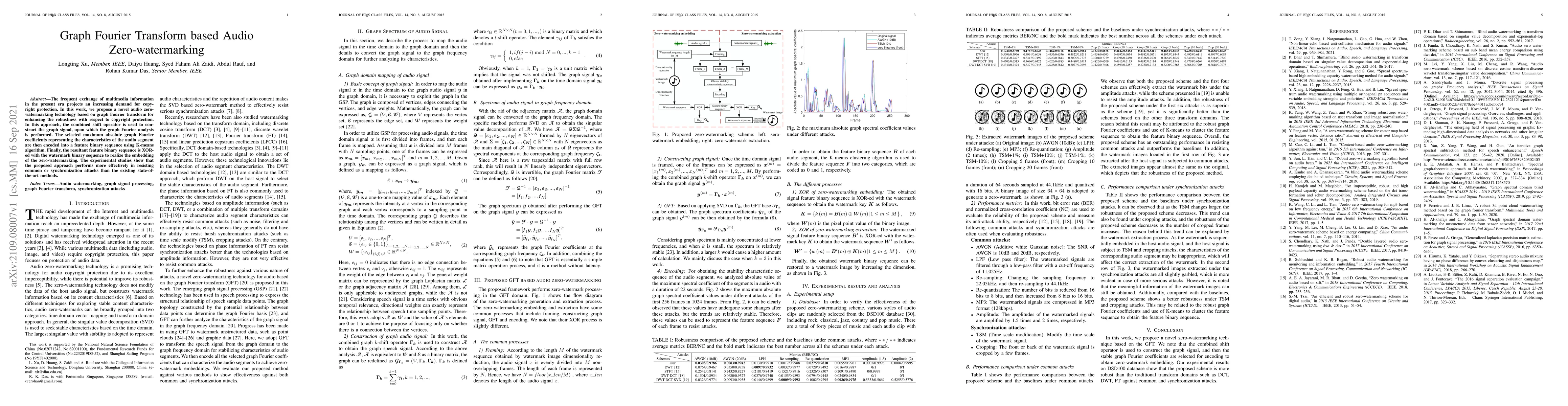 This paper proposes a novel audio zero-watermarking technique using graph Fourier transform to enhance copyright protection. The method embeds a watermark by encoding maximum absolute graph Fourier coefficients into a binary sequence, which is then XOR-ed with a watermark binary sequence. The approach demonstrates superior robustness against common and synchronization attacks compared to existing methods.