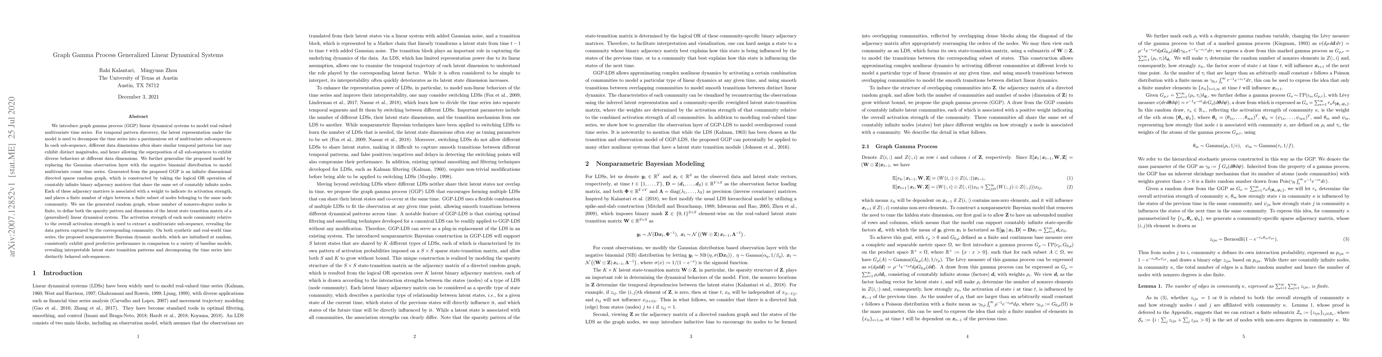 This paper introduces graph gamma process (GGP) linear dynamical systems to model real-valued multivariate time series, decomposing them into parsimonious sub-sequences. The model is generalized for multivariate count time series by using a negative binomial distribution, and it generates an infinite directed sparse random graph to define the latent state transition matrix, demonstrating good predictive performance on both synthetic and real-world data.