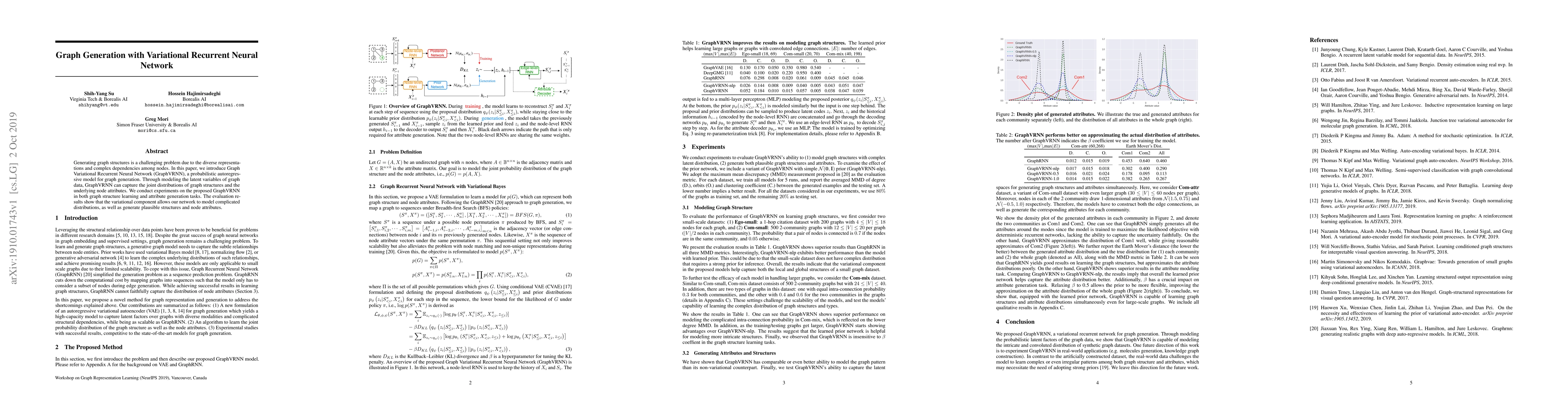 This paper introduces GraphVRNN, a probabilistic autoregressive model for generating graph structures by modeling latent variables. Experiments show that the variational component effectively captures complex distributions and generates plausible graph structures and node attributes.