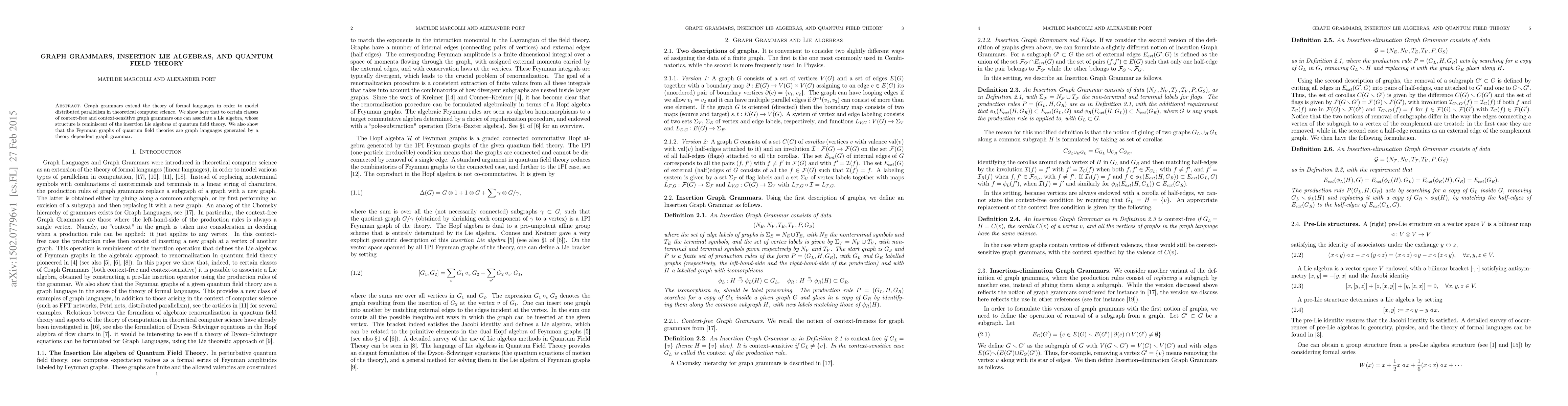 Graph grammars extend the theory of formal languages in order to model distributed parallelism in theoretical computer science. We show here that to certain classes of context-free and context-sensitive graph grammars one can associate a Lie algebra, whose structure is reminiscent of the insertion Lie algebras of quantum field theory. We also show that the Feynman graphs of quantum field theories are graph languages generated by a theory dependent graph grammar.