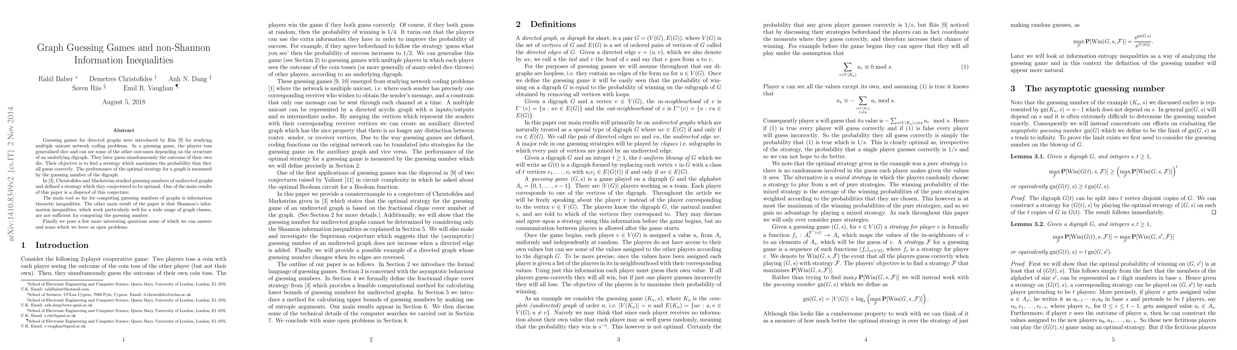 This paper disproves a conjecture regarding optimal strategies for guessing games in undirected graphs and shows that Shannon's information inequalities are insufficient for determining the guessing number in directed graphs, proposing new questions and open problems in the field.