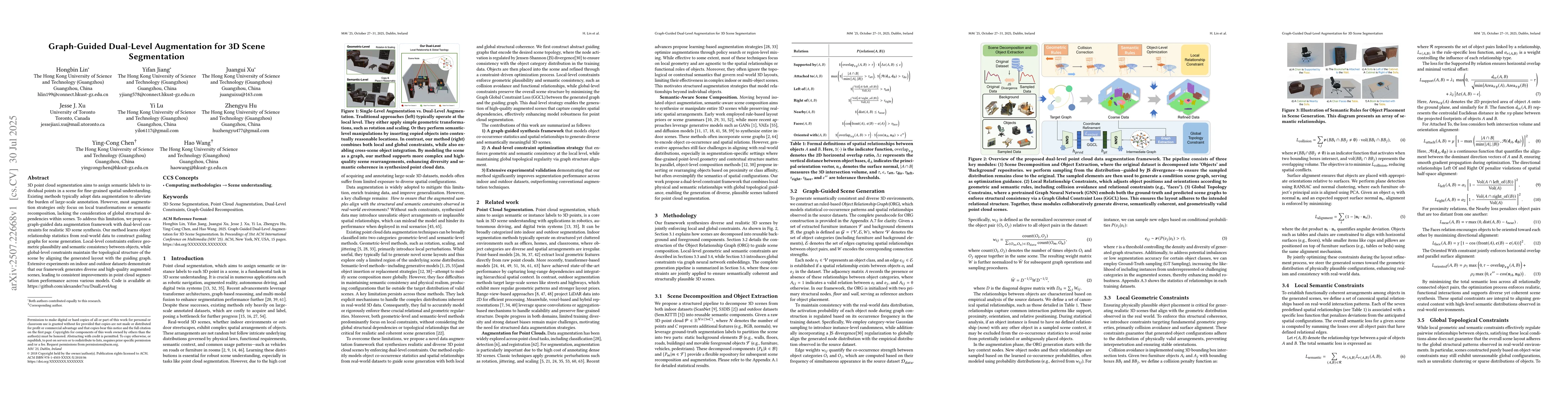 The research proposes a graph-guided data augmentation framework for 3D scene segmentation, utilizing dual-level constraints to generate realistic scenes. It learns object relationship statistics from real-world data to construct guiding graphs, enforcing local geometric plausibility and semantic consistency, and maintaining global scene topological structure.