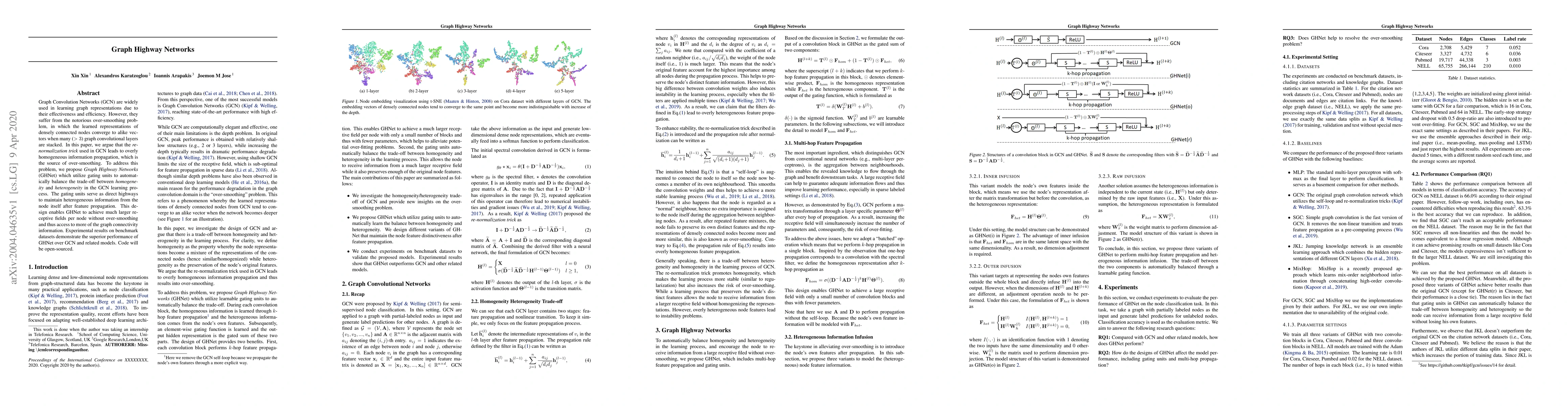 This paper proposes Graph Highway Networks (GHNet) to address the over-smoothing issue in Graph Convolutional Networks (GCN). GHNet uses gating units to balance information propagation, maintaining node heterogeneity and achieving larger receptive fields without convergence to similar node representations.