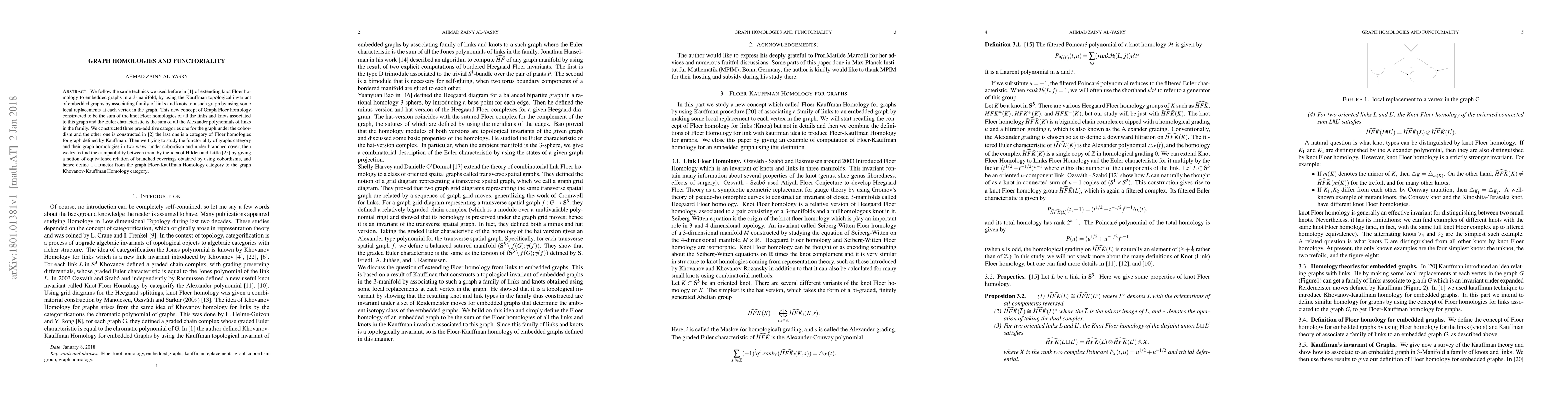This paper extends knot Floer homology to embedded graphs in 3-manifolds using the Kauffman invariant and constructs a Graph Floer homology. It explores functoriality under cobordism and branched covers, establishing a compatibility between these two approaches.