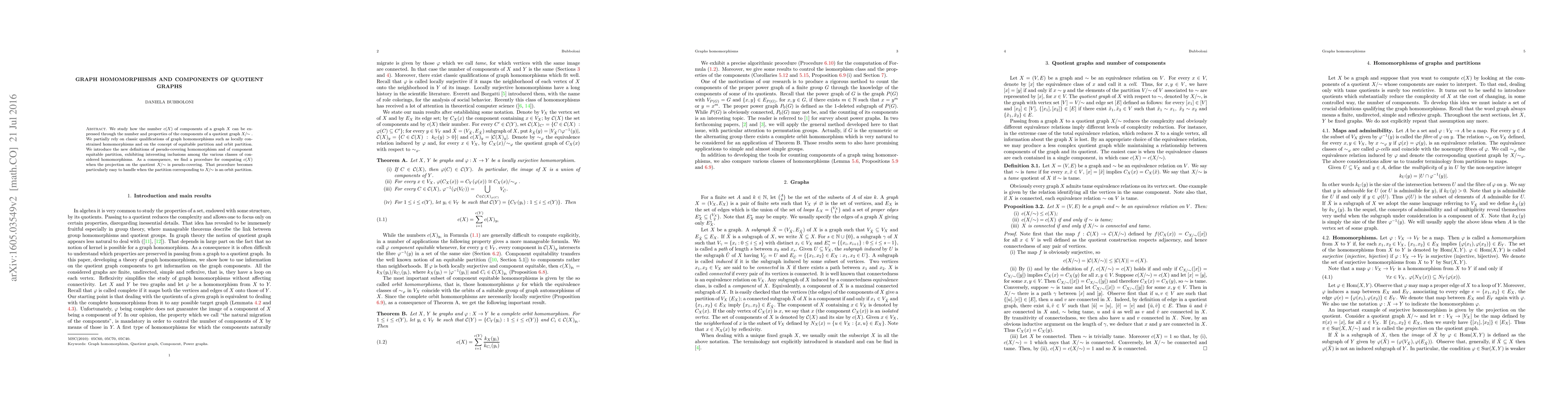 This paper explores the relationship between the number of components in a graph and its quotient graph, introducing new definitions like pseudo-covering homomorphisms and component equitable partitions. It provides a method to compute the number of components of a graph when its projection onto a quotient graph is pseudo-covering, especially simplifying for orbit partitions.