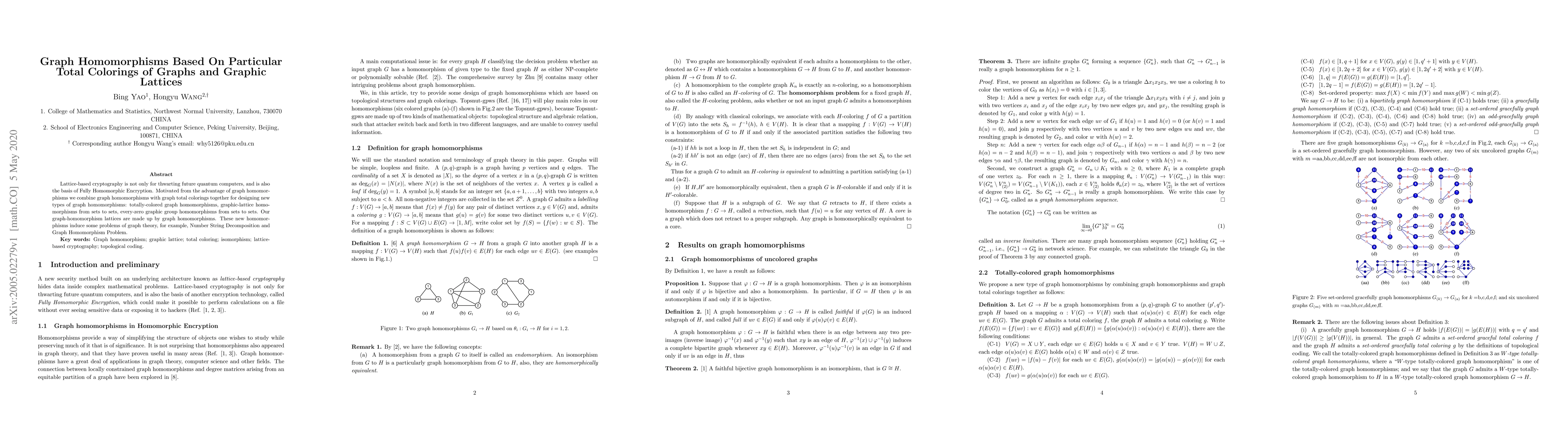 Lattice-based cryptography is not only for thwarting future quantum computers, and is also the basis of Fully Homomorphic Encryption. Motivated from the advantage of graph homomorphisms we combine graph homomorphisms with graph total colorings together for designing new types of graph homomorphisms: totally-colored graph homomorphisms, graphic-lattice homomorphisms from sets to sets, every-zero graphic group homomorphisms from sets to sets. Our graph-homomorphism lattices are made up by graph homomorphisms. These new homomorphisms induce some problems of graph theory, for example, Number String Decomposition and Graph Homomorphism Problem.