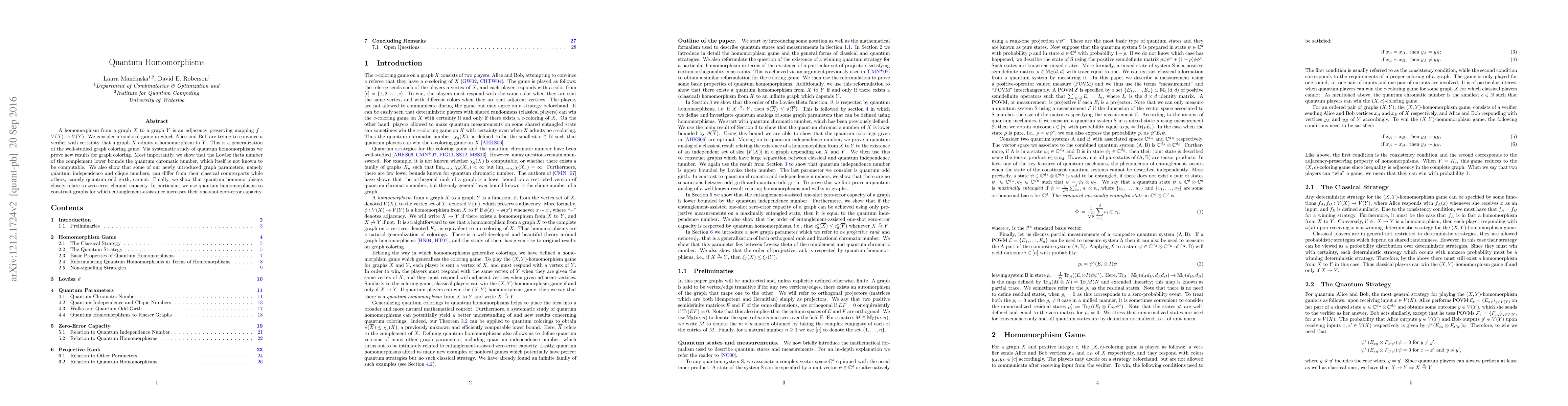 A homomorphism from a graph $X$ to a graph $Y$ is an adjacency preserving mapping $f:V(X) \rightarrow V(Y)$. We consider a nonlocal game in which Alice and Bob are trying to convince a verifier with certainty that a graph $X$ admits a homomorphism to $Y$. This is a generalization of the well-studied graph coloring game. Via systematic study of quantum homomorphisms we prove new results for graph coloring. Most importantly, we show that the Lov\'{a}sz theta number of the complement lower bounds the quantum chromatic number, which itself is not known to be computable. We also show that some of our newly introduced graph parameters, namely quantum independence and clique numbers, can differ from their classical counterparts while others, namely quantum odd girth, cannot. Finally, we show that quantum homomorphisms closely relate to zero-error channel capacity. In particular, we use quantum homomorphisms to construct graphs for which entanglement-assistance increases their one-shot zero-error capacity.
