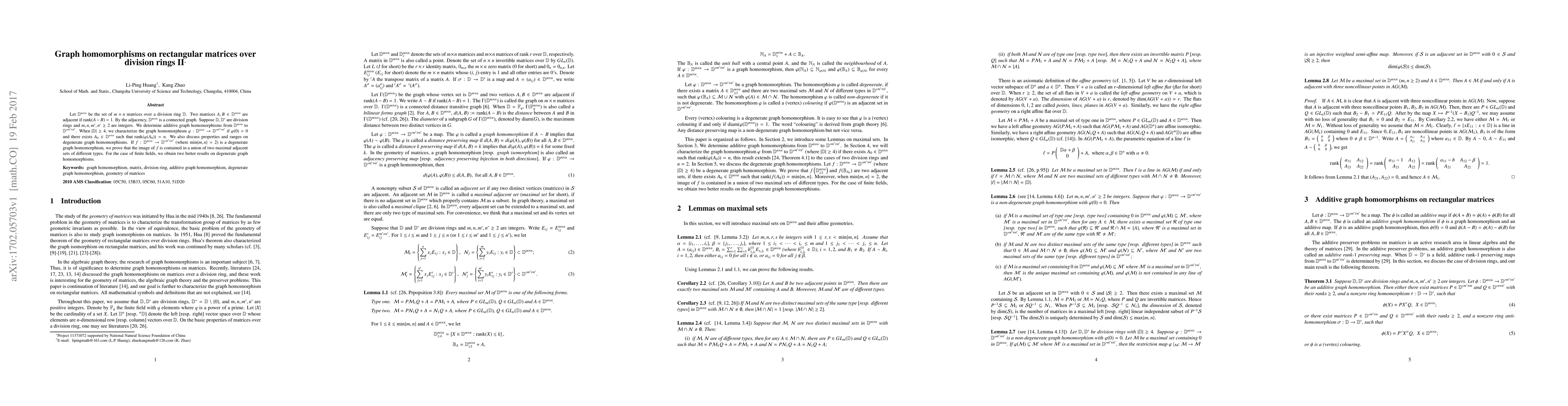 This paper investigates additive graph homomorphisms between rectangular matrices over division rings, focusing on the adjacency defined by rank conditions. It characterizes specific graph homomorphisms when the division ring has at least four elements and explores the properties and ranges of degenerate graph homomorphisms, proving that their images lie within a union of two maximal adjacent sets.