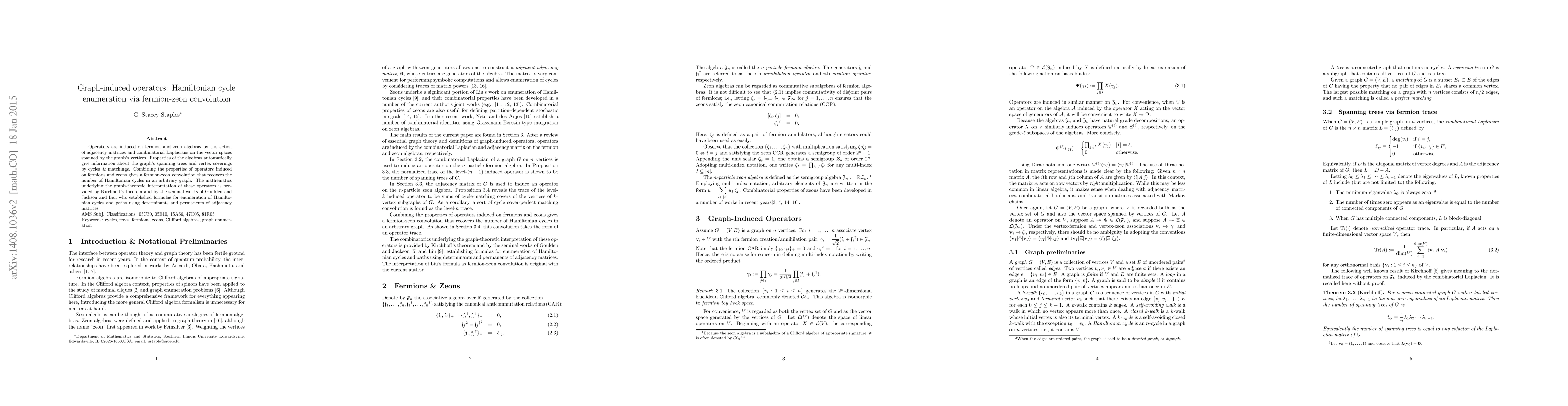 Operators are induced on fermion and zeon algebras by the action of adjacency matrices and combinatorial Laplacians on the vector spaces spanned by the graph's vertices. Properties of the algebras automatically give information about the graph's spanning trees and vertex coverings by cycles \& matchings. Combining the properties of operators induced on fermions and zeons gives a fermion-zeon convolution that recovers the number of Hamiltonian cycles in an arbitrary graph. The mathematics underlying the graph-theoretic interpretation of these operators is provided by Kirchhoff's theorem and by the seminal works of Goulden and Jackson and Liu, who established formulas for enumeration of Hamiltonian cycles and paths using determinants and permanents of adjacency matrices.