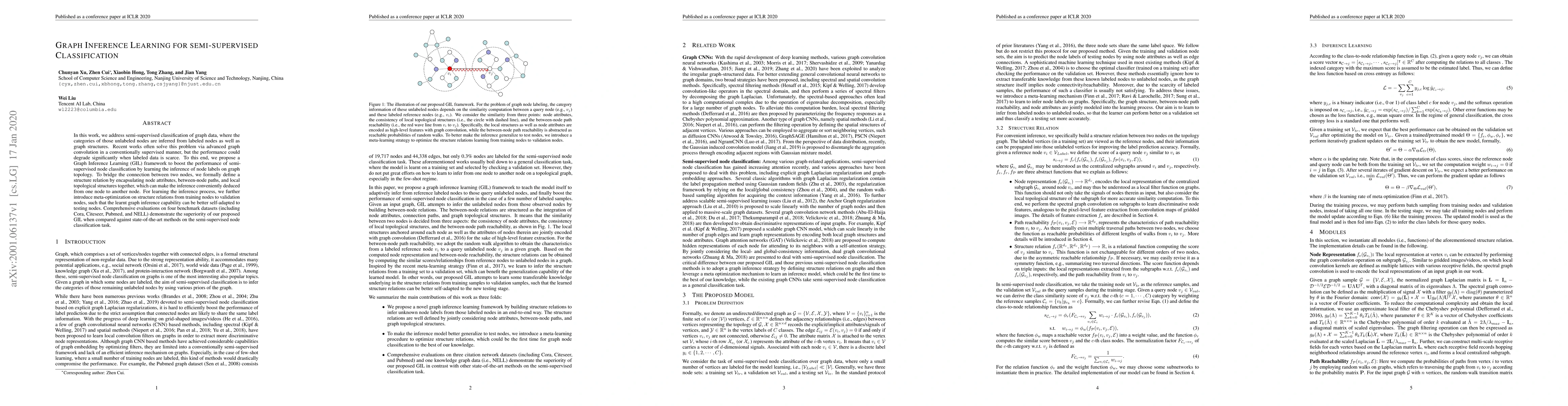 In this work, we address semi-supervised classification of graph data, where the categories of those unlabeled nodes are inferred from labeled nodes as well as graph structures. Recent works often solve this problem via advanced graph convolution in a conventionally supervised manner, but the performance could degrade significantly when labeled data is scarce. To this end, we propose a Graph Inference Learning (GIL) framework to boost the performance of semi-supervised node classification by learning the inference of node labels on graph topology. To bridge the connection between two nodes, we formally define a structure relation by encapsulating node attributes, between-node paths, and local topological structures together, which can make the inference conveniently deduced from one node to another node. For learning the inference process, we further introduce meta-optimization on structure relations from training nodes to validation nodes, such that the learnt graph inference capability can be better self-adapted to testing nodes. Comprehensive evaluations on four benchmark datasets (including Cora, Citeseer, Pubmed, and NELL) demonstrate the superiority of our proposed GIL when compared against state-of-the-art methods on the semi-supervised node classification task.