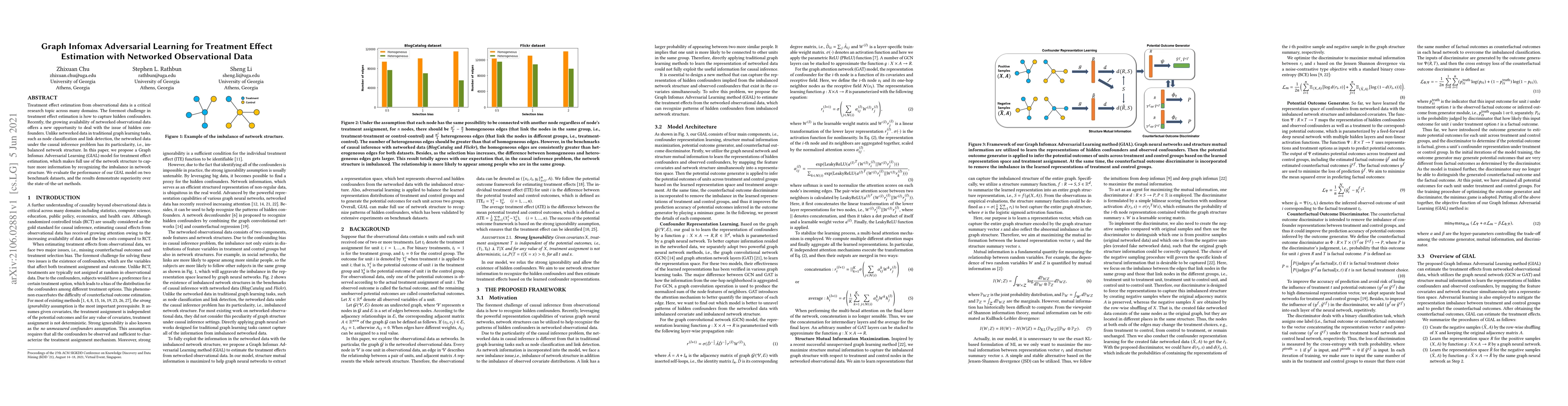 Treatment effect estimation from observational data is a critical research topic across many domains. The foremost challenge in treatment effect estimation is how to capture hidden confounders. Recently, the growing availability of networked observational data offers a new opportunity to deal with the issue of hidden confounders. Unlike networked data in traditional graph learning tasks, such as node classification and link detection, the networked data under the causal inference problem has its particularity, i.e., imbalanced network structure. In this paper, we propose a Graph Infomax Adversarial Learning (GIAL) model for treatment effect estimation, which makes full use of the network structure to capture more information by recognizing the imbalance in network structure. We evaluate the performance of our GIAL model on two benchmark datasets, and the results demonstrate superiority over the state-of-the-art methods.