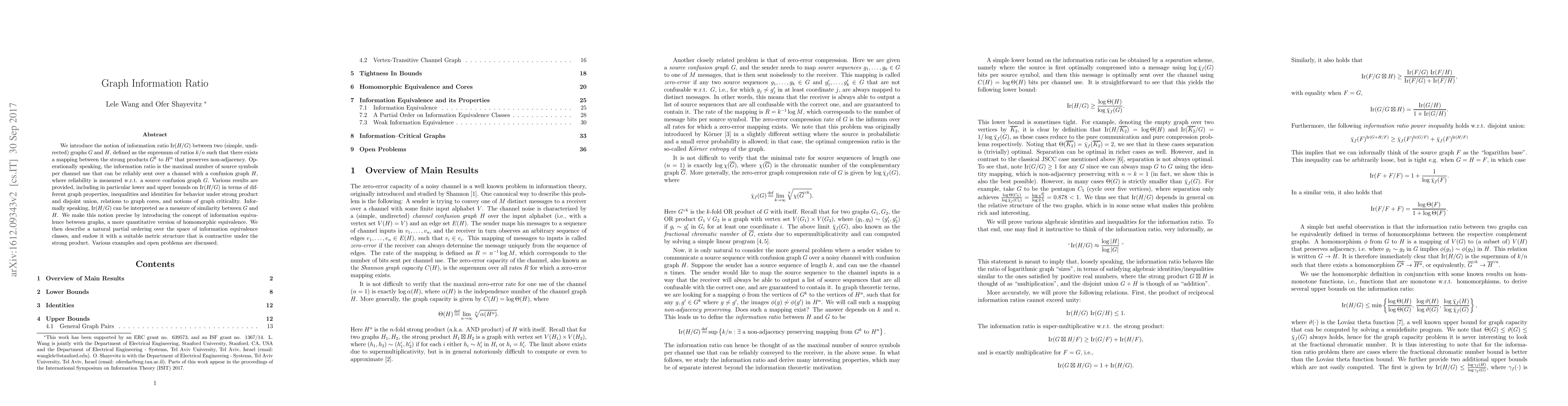 The paper introduces the information ratio $\text{Ir}(H/G)$ between two graphs, defined as the supremum of ratios of strong product mappings that preserve non-adjacency, and explores its properties, bounds, and applications as a measure of graph similarity. It also discusses information equivalence and a metric structure over equivalence classes.