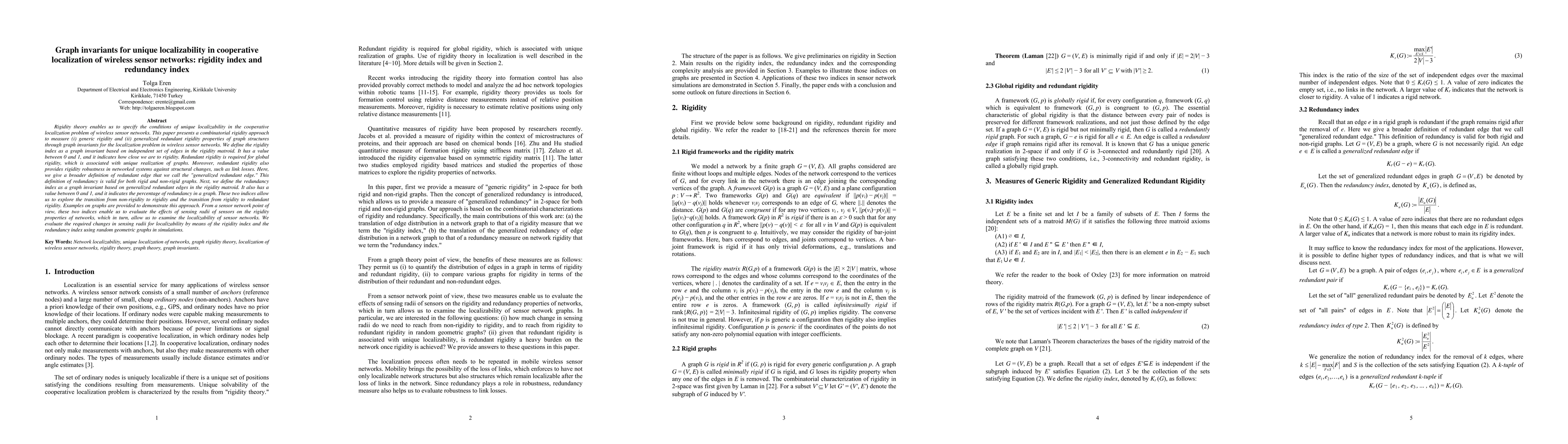 This paper introduces graph invariants—rigidity index and redundancy index—to assess unique localizability in wireless sensor networks. The rigidity index measures generic rigidity, while the redundancy index gauges generalized redundant rigidity, providing insights into network robustness and localizability.