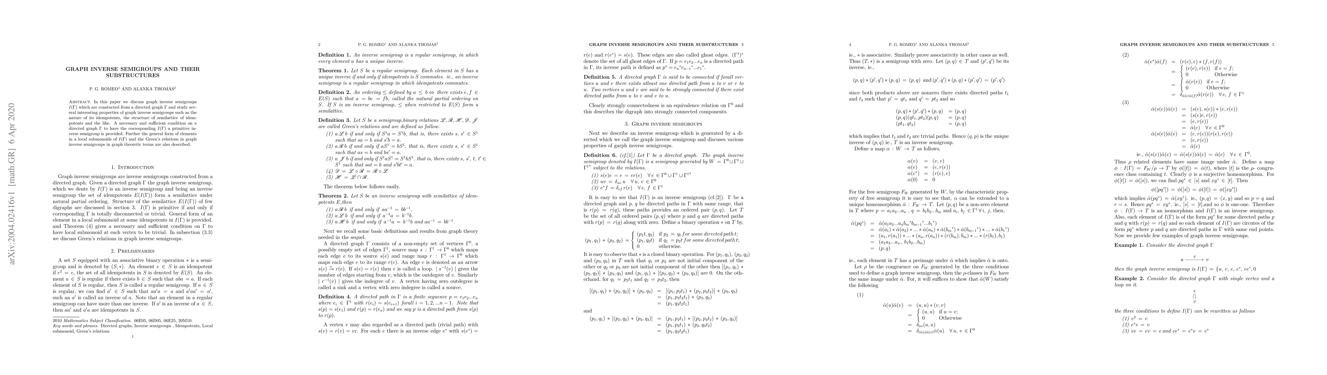 This paper explores graph inverse semigroups derived from directed graphs, detailing properties such as the nature of idempotents and the structure of their semilattices. It provides conditions for directed graphs to yield primitive inverse semigroups and describes elements and Green's relations in these semigroups in graph-theoretic terms.