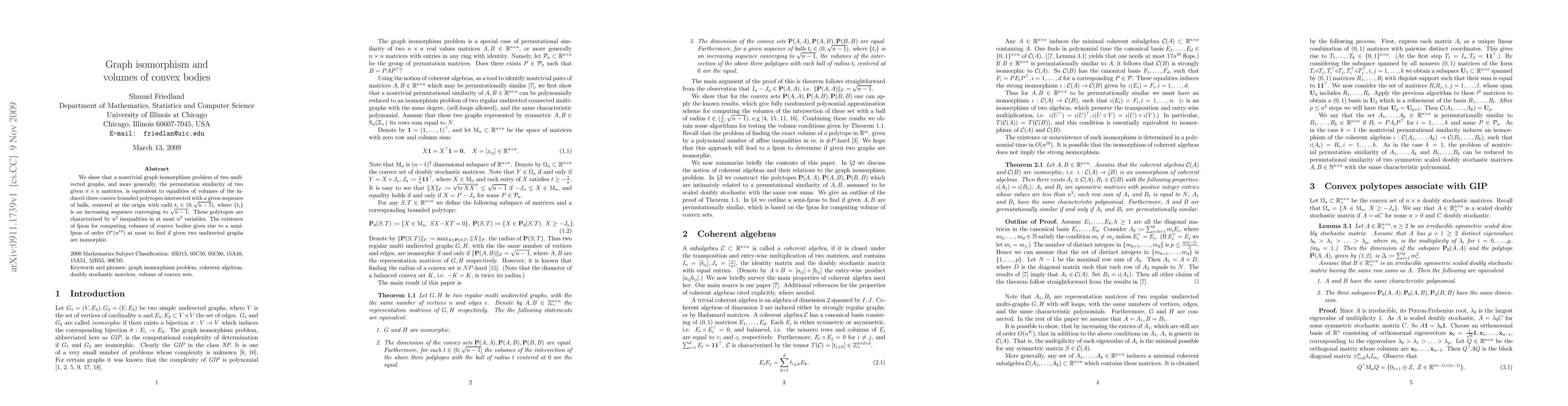 We show that a nontrivial graph isomorphism problem of two undirected graphs, and more generally, the permutation similarity of two given $n\times n$ matrices, is equivalent to equalities of volumes of the induced three convex bounded polytopes intersected with a given sequence of balls, centered at the origin with radii $t_i\in (0,\sqrt{n-1})$, where $\{t_i\}$ is an increasing sequence converging to $\sqrt{n-1}$. These polytopes are characterized by $n^2$ inequalities in at most $n^2$ variables. The existence of fpras for computing volumes of convex bodies gives rise to a semi-frpas of order $O^*(n^{14})$ at most to find if given two undirected graphs are isomorphic.