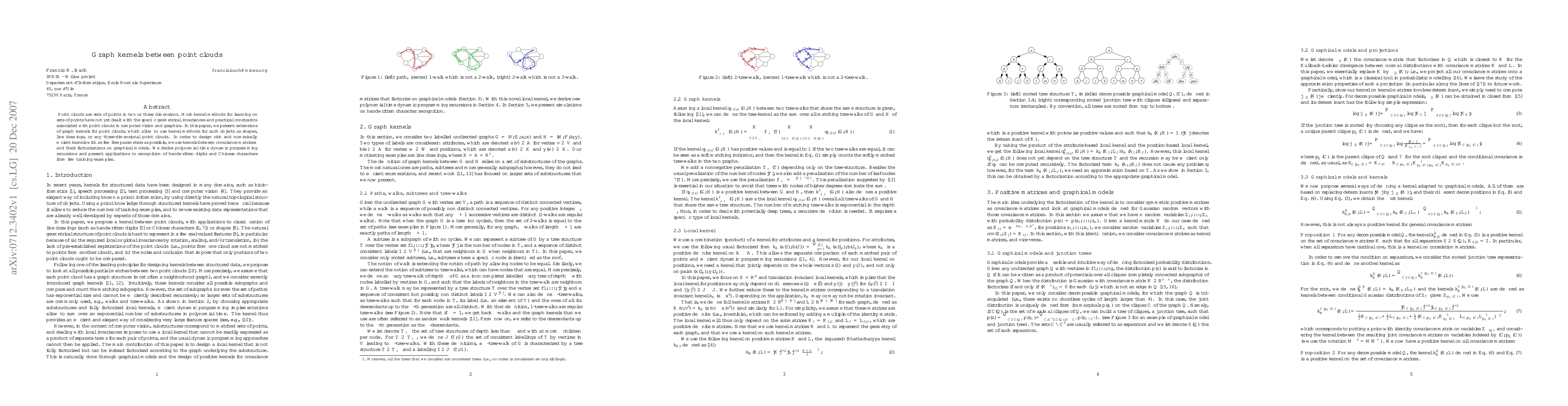 Point clouds are sets of points in two or three dimensions. Most kernel methods for learning on sets of points have not yet dealt with the specific geometrical invariances and practical constraints associated with point clouds in computer vision and graphics. In this paper, we present extensions of graph kernels for point clouds, which allow to use kernel methods for such ob jects as shapes, line drawings, or any three-dimensional point clouds. In order to design rich and numerically efficient kernels with as few free parameters as possible, we use kernels between covariance matrices and their factorizations on graphical models. We derive polynomial time dynamic programming recursions and present applications to recognition of handwritten digits and Chinese characters from few training examples.