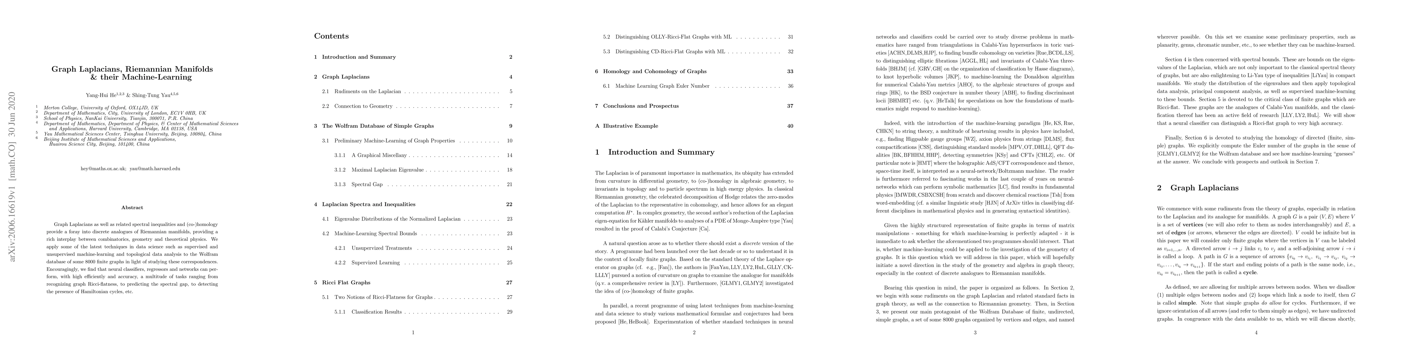 Graph Laplacians as well as related spectral inequalities and (co-)homology provide a foray into discrete analogues of Riemannian manifolds, providing a rich interplay between combinatorics, geometry and theoretical physics. We apply some of the latest techniques in data science such as supervised and unsupervised machine-learning and topological data analysis to the Wolfram database of some 8000 finite graphs in light of studying these correspondences. Encouragingly, we find that neural classifiers, regressors and networks can perform, with high efficiently and accuracy, a multitude of tasks ranging from recognizing graph Ricci-flatness, to predicting the spectral gap, to detecting the presence of Hamiltonian cycles, etc.
