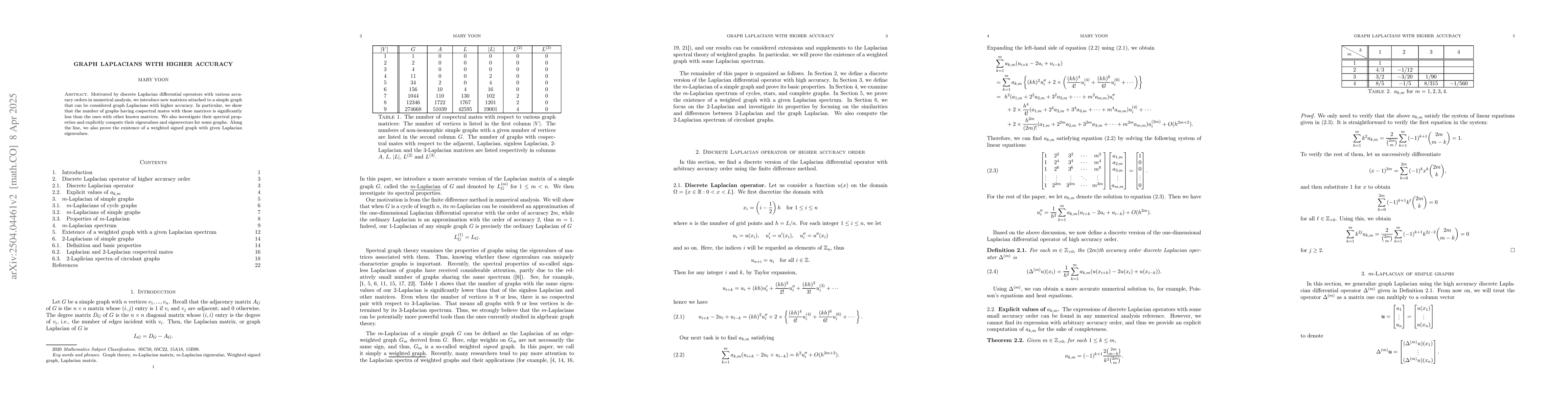 Motivated by discrete Laplacian differential operators with various accuracy orders in numerical analysis, we introduce new matrices attached to a simple graph that can be considered graph Laplacians with higher accuracy. In particular, we show that the number of graphs having cospectral mates with these matrices is significantly less than the ones with other known matrices. We also investigate their spectral properties and explicitly compute their eigenvalues and eigenvectors for some graphs. Along the line, we also prove the existence of a weighted signed graph with given Laplacian eigenvalues.