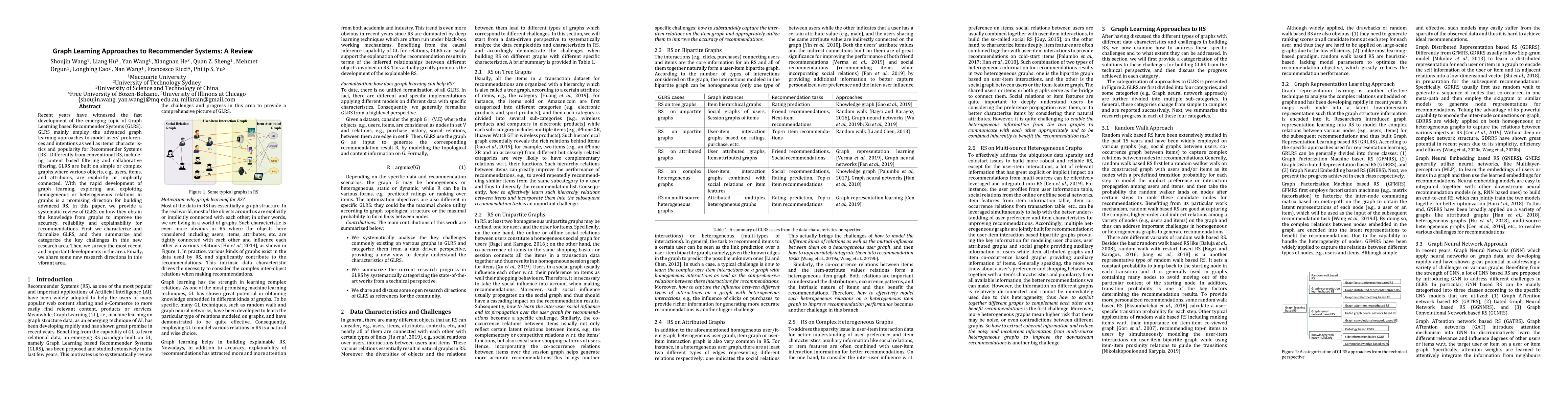 This paper reviews Graph Learning based Recommender Systems (GLRS), highlighting how advanced graph learning techniques model user preferences and item characteristics. It systematically characterizes GLRS, surveys recent developments, and discusses key challenges and future research directions in this evolving field.
