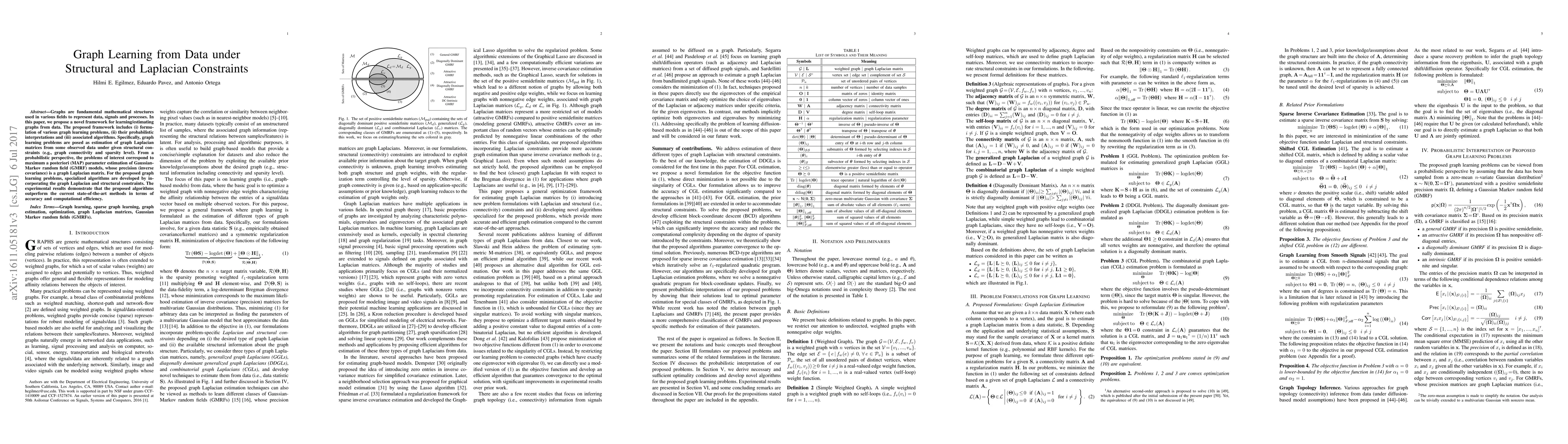 This paper proposes a new framework for estimating graph Laplacian matrices from data under structural constraints, framed as maximum a posteriori estimation of Gaussian-Markov random field models. The developed algorithms outperform existing methods in accuracy and computational efficiency.