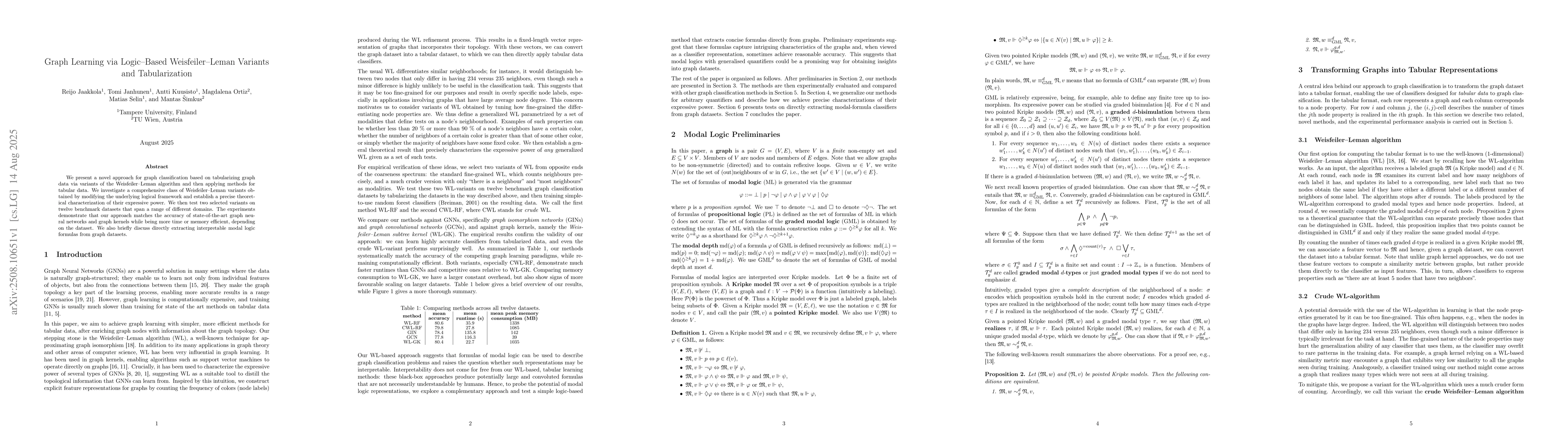 We present a novel approach for graph classification based on tabularizing graph data via variants of the Weisfeiler-Leman algorithm and then applying methods for tabular data. We investigate a comprehensive class of Weisfeiler-Leman variants obtained by modifying the underlying logical framework and establish a precise theoretical characterization of their expressive power. We then test two selected variants on twelve benchmark datasets that span a range of different domains. The experiments demonstrate that our approach matches the accuracy of state-of-the-art graph neural networks and graph kernels while being more time or memory efficient, depending on the dataset. We also briefly discuss directly extracting interpretable modal logic formulas from graph datasets.