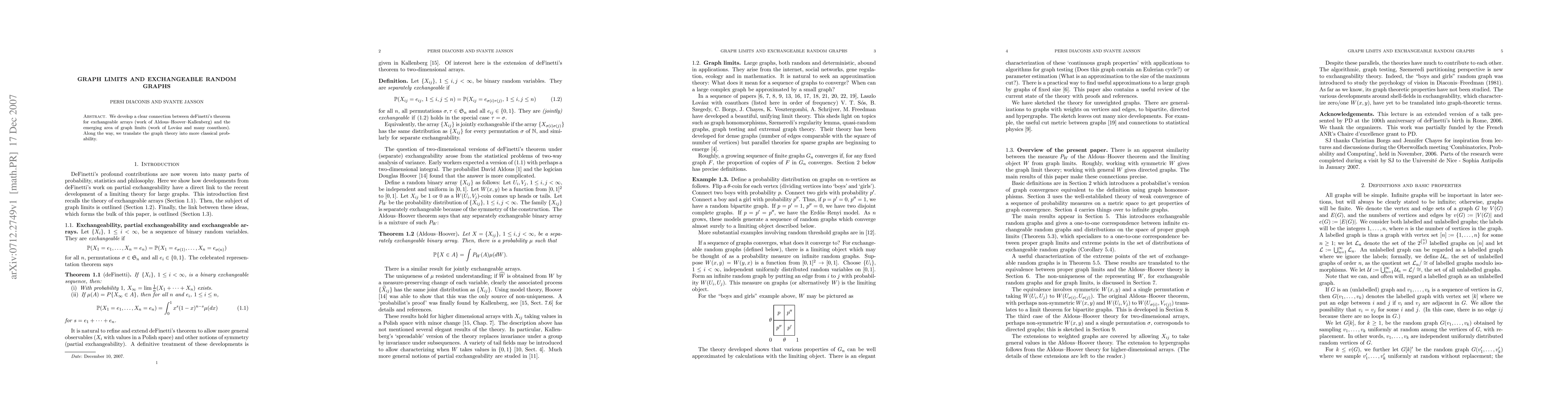 Summary: This paper bridges deFinetti's theorem on exchangeable arrays with the theory of graph limits, translating graph theoretical concepts into classical probability to establish a clear connection between the two fields.