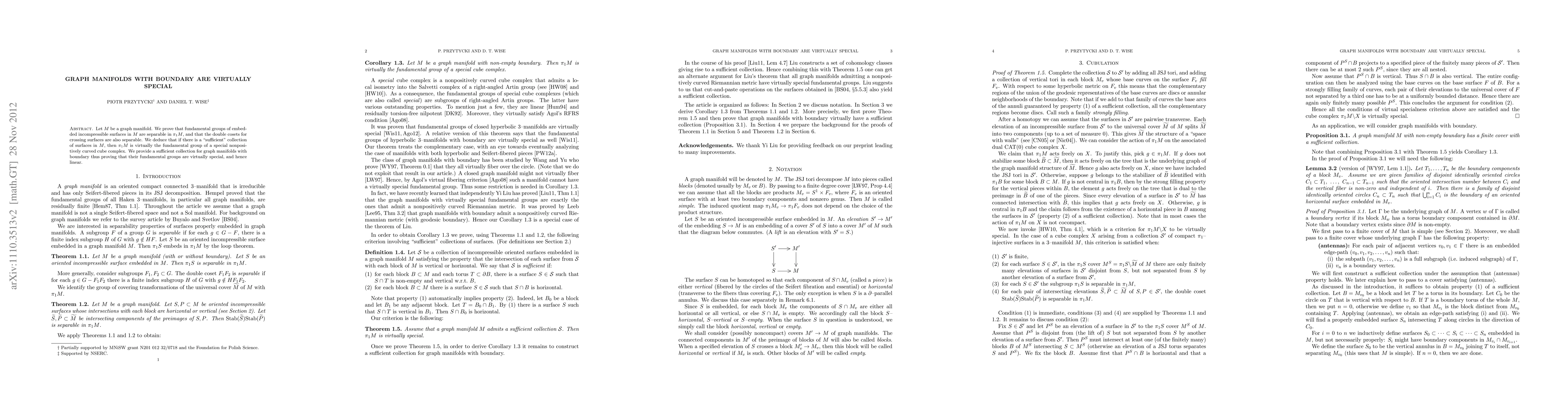 The paper proves that graph manifolds with boundary have fundamental groups that are virtually special, implying they are linear. It demonstrates the separability of embedded incompressible surfaces' fundamental groups within the larger group and establishes a sufficient collection of surfaces to achieve this result.