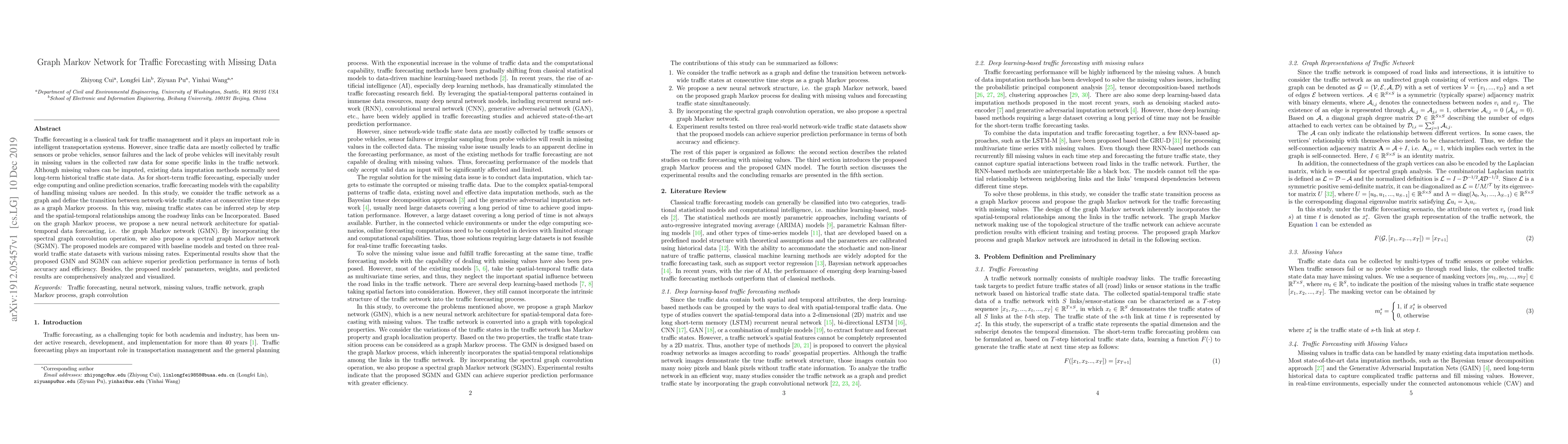 This paper proposes a graph Markov network (GMN) and its spectral variant (SGMN) for short-term traffic forecasting under missing data conditions. The models leverage spatial-temporal relationships and perform step-by-step inference of missing traffic states, achieving superior prediction accuracy and efficiency compared to baseline models.