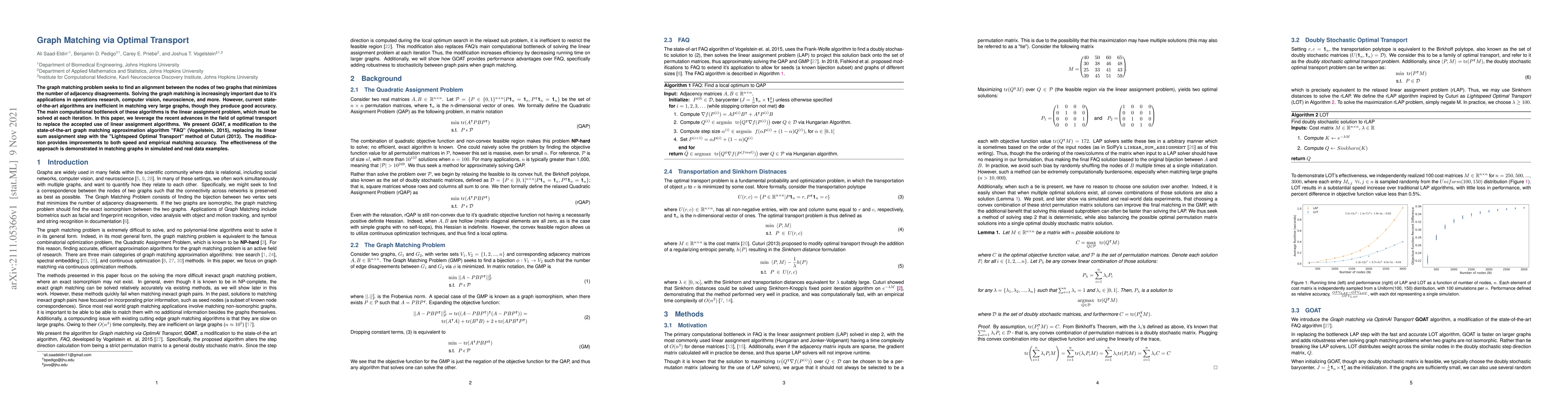 This paper introduces GOAT, a novel graph matching method that replaces the linear assignment problem with optimal transport, improving both speed and accuracy over existing algorithms. The method demonstrates enhanced performance in both simulated and real-world graph matching scenarios.