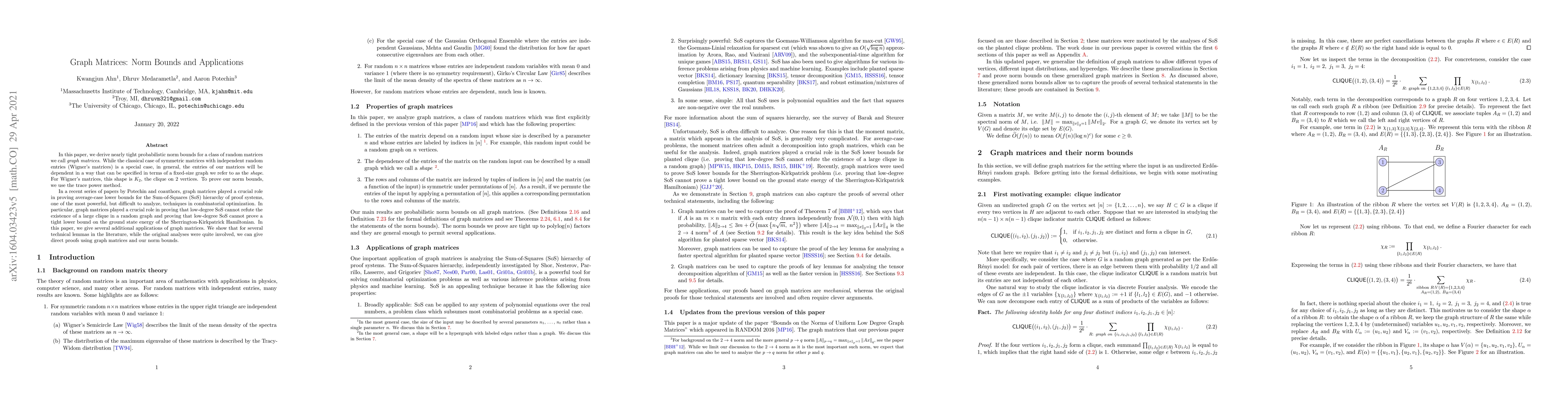 This paper derives nearly tight probabilistic norm bounds for graph matrices, which generalize Wigner's matrices, and applies these bounds to simplify and clarify several technical lemmas in combinatorial optimization and the Sum-of-Squares (SoS) hierarchy. The trace power method is used to establish the norm bounds.