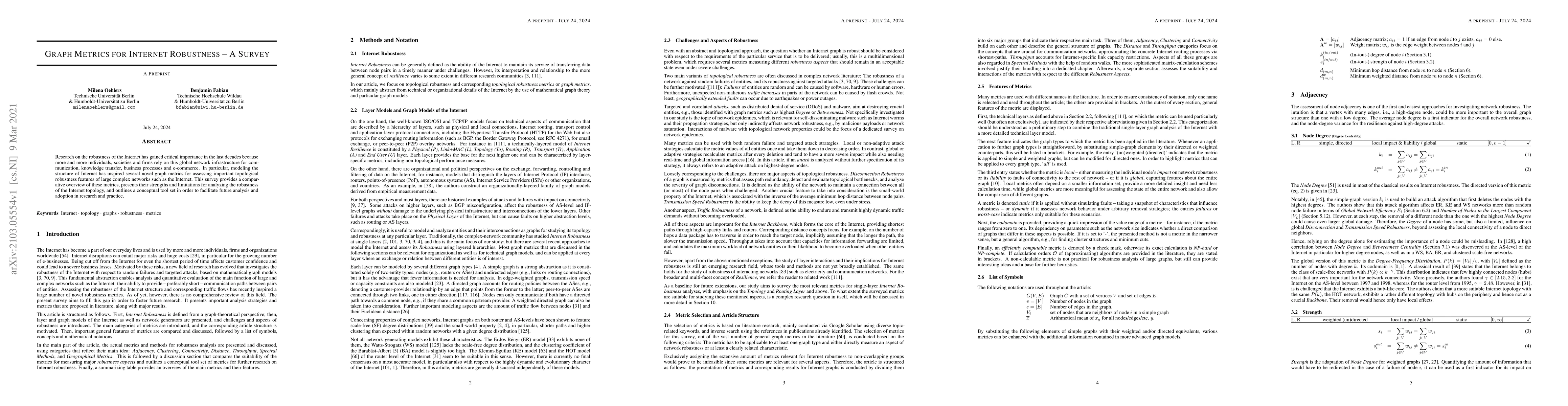 This survey reviews various graph metrics used to assess the topological robustness of the Internet, highlighting their strengths and limitations for analyzing Internet infrastructure. It aims to provide a conceptual toolkit for future research and practical applications.