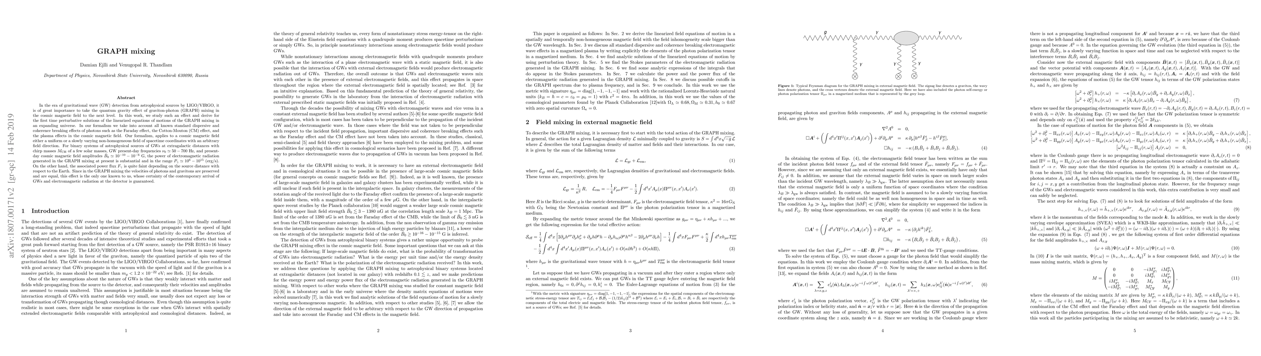 In the era of gravitational wave (GW) detection from astrophysical sources by LIGO/VIRGO, it is of great importance to take the quantum gravity effect of graviton-photon (GRAPH) mixing in the cosmic magnetic field to the next level. In this work, we study such an effect and derive for the first time perturbative solutions of the linearized equations of motions of the GRAPH mixing in an expanding universe. In our formalism we take into account all known standard dispersive and coherence breaking effects of photons such as the Faraday effect, the Cotton-Mouton (CM) effect, and the plasma effects in the cosmic magnetic field. Our formalism, applies to a cosmic magnetic field either a uniform or a slowly varying non-homogeneous field of spacetime coordinates with an arbitrary field direction. For binary systems of astrophysical sources of GWs at extragalactic distances with chirp masses $M_\text{CH}$ of a few solar masses, GW present-day frequencies $\nu_0\simeq 50-700$ Hz, and present-day cosmic magnetic field amplitudes $\bar B_0\simeq 10^{-10}-10^{-6}$ G, the power of electromagnetic radiation generated in the GRAPH mixing at present is substantial and in the range $P_\gamma\simeq 10^6-10^{15}$ (erg/s). On the other hand, the associated power flux $F_\gamma$ is quite faint depending on the source distance with respect to the Earth. Since in the GRAPH mixing the velocities of photons and gravitons are preserved and are equal, this effect is the only one known to us, whose certainty of the contemporary arrival of GWs and electromagnetic radiation at the detector is guaranteed.
