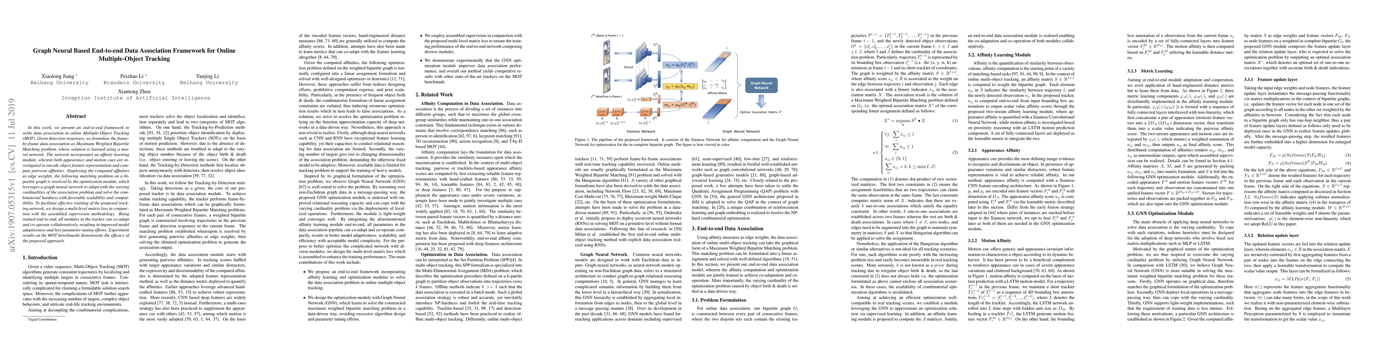 This paper proposes an end-to-end framework for online Multiple-Object Tracking using a graph neural network to solve the data association problem as a Maximum Weighted Bipartite Matching. The network incorporates an affinity learning module that leverages appearance and motion cues for feature representation and pairwise affinities.