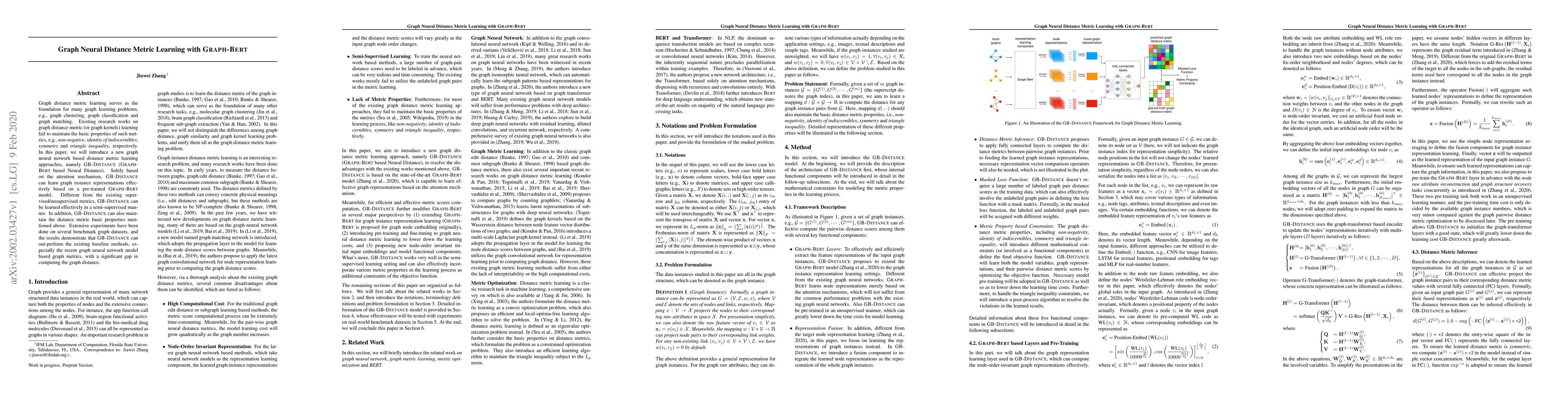 This paper introduces GB-DISTANCE, a novel graph neural network-based distance metric learning method using GRAPH-BERT, which effectively learns graph representations and maintains fundamental metric properties. GB-DISTANCE outperforms existing methods on benchmark datasets, especially in semi-supervised learning scenarios.