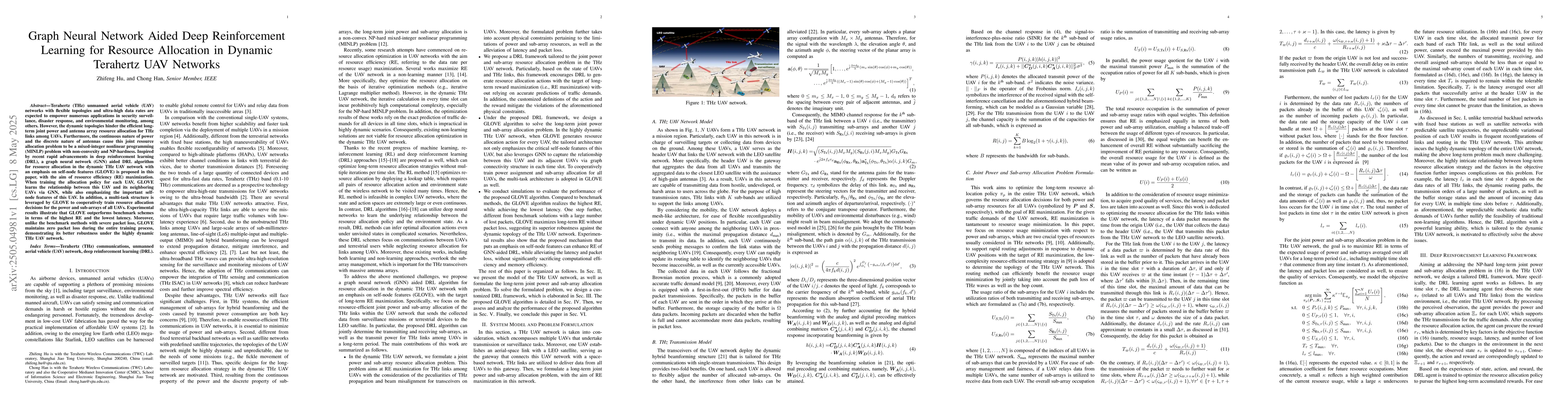 This paper proposes a GNN-aided DRL algorithm named GLOVE for resource allocation in dynamic THz UAV networks, aiming to maximize resource efficiency. The method leverages GNN to learn inter-UAV relationships and emphasizes self-node features, while a multi-task structure trains joint power and antenna allocation decisions, outperforming benchmarks in efficiency and robustness.