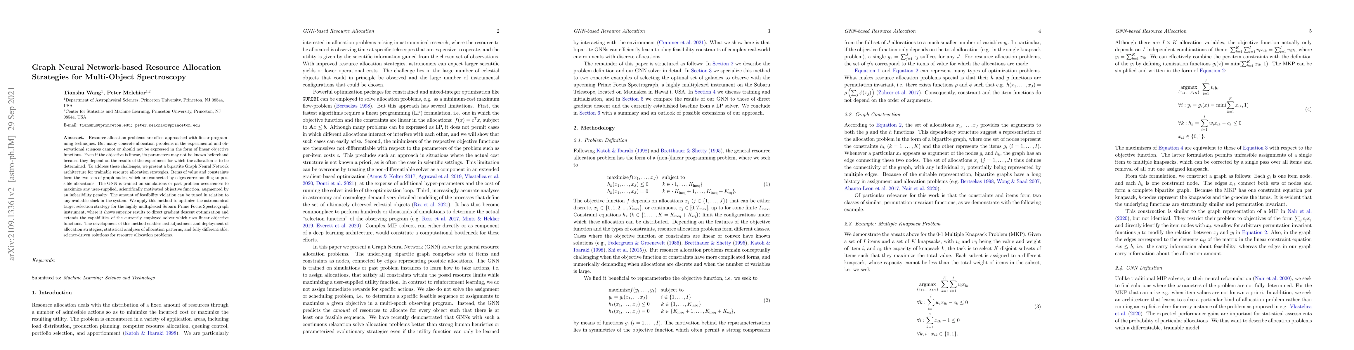This paper proposes a Graph Neural Network (GNN) architecture for optimizing resource allocation in multi-object spectroscopy, addressing non-linear objectives and unknown parameters. The GNN trains on simulations to maximize user-defined objectives, demonstrating superior performance in optimizing the Subaru Prime Focus Spectrograph's target selection strategy compared to traditional methods.