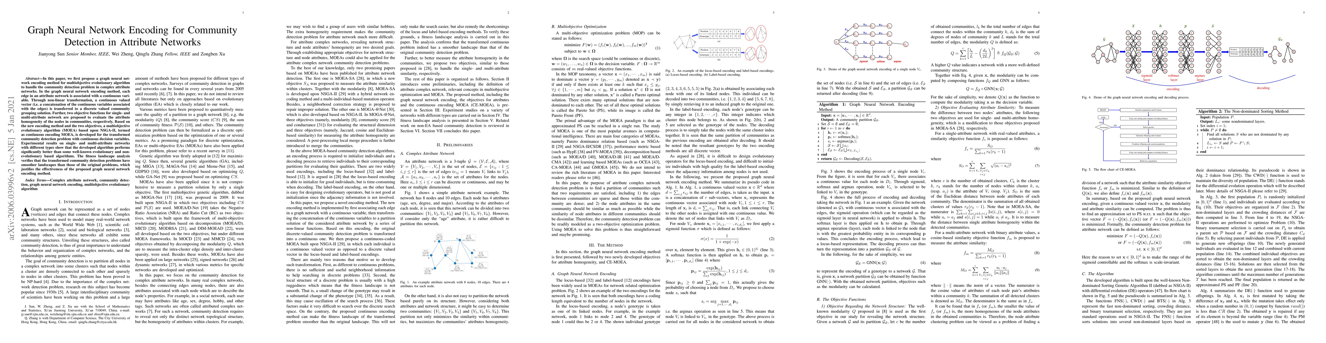 This paper proposes a graph neural network encoding method for a multiobjective evolutionary algorithm to enhance community detection in complex attribute networks. The method transforms continuous edge variables into discrete community grouping solutions, and a new MOEA based on NSGA-II is developed, showing superior performance over existing algorithms.