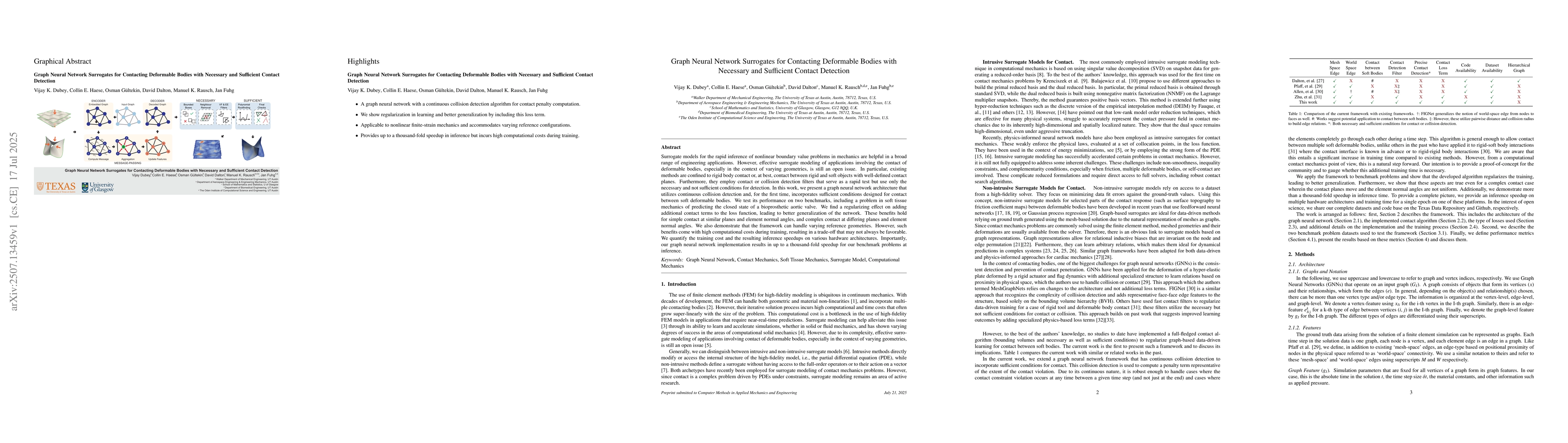This research introduces a graph neural network architecture to model contact between soft deformable bodies, addressing limitations of previous methods. The model uses continuous collision detection and sufficient contact conditions, improving generalization with added contact terms in loss function. While it excels in handling complex contact scenarios and varying geometries, high computational costs during training present a trade-off. The method achieves significant inference speedups, up to a thousand-fold, on benchmark problems.