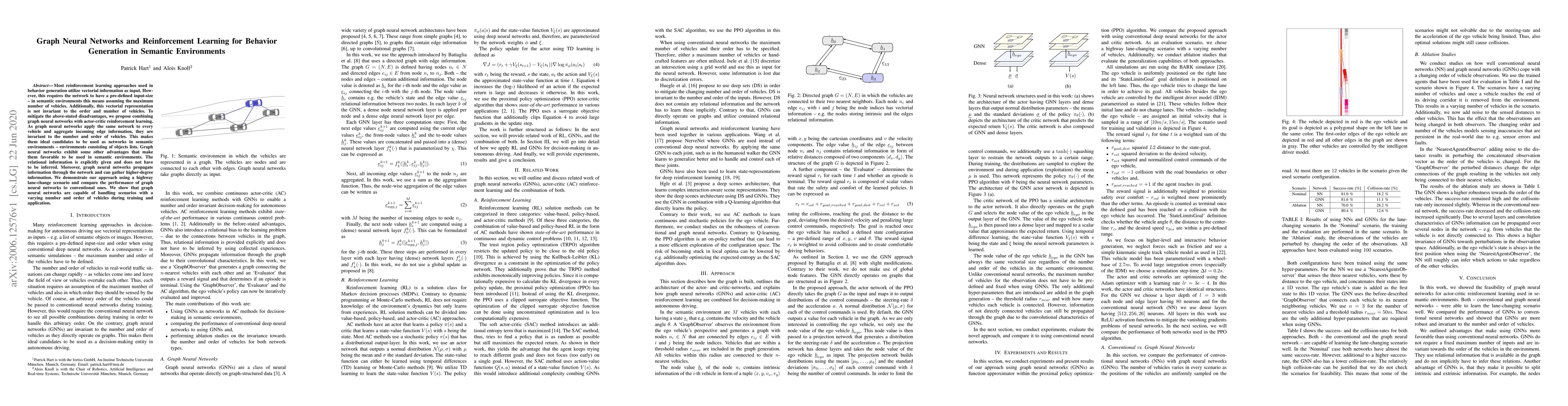 This paper combines graph neural networks with actor-critic reinforcement learning to generate behavior in semantic environments, where the number and order of objects like vehicles can vary. The proposed method leverages the invariance and relational information advantages of graph neural networks to outperform conventional vectorial approaches.
