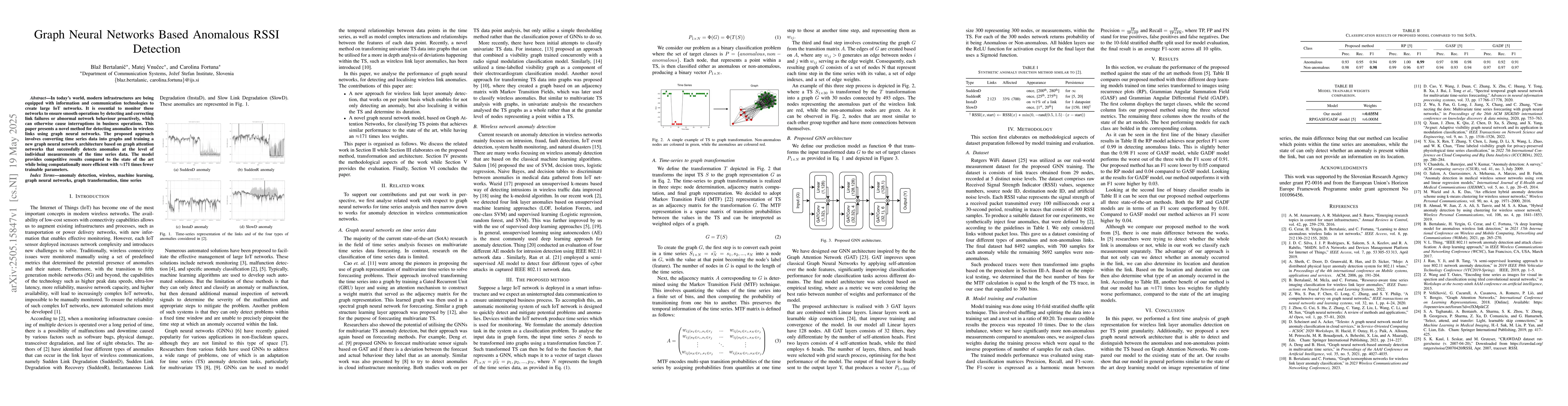 This work is novel due to its application of graph neural networks, specifically graph attention networks, to detect anomalies in RSSI time series data, offering competitive performance with reduced computational requirements.