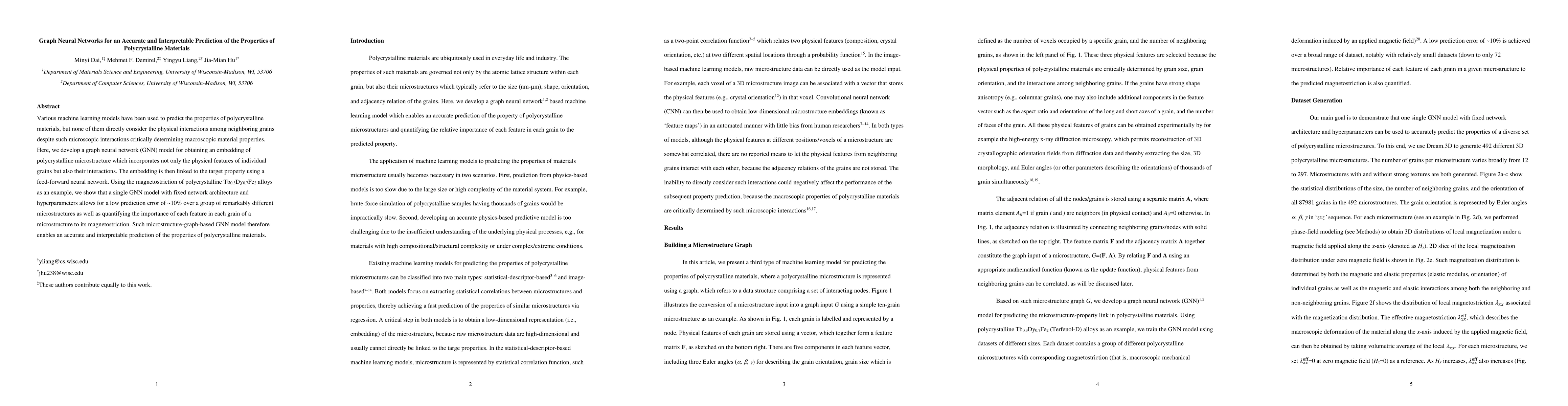 This paper develops a graph neural network (GNN) model to predict the properties of polycrystalline materials by incorporating physical interactions among neighboring grains. The GNN model achieves a low prediction error of ~10% for magnetostriction in Tb0.3Dy0.7Fe2 alloys, demonstrating both accuracy and interpretability by quantifying feature importance.