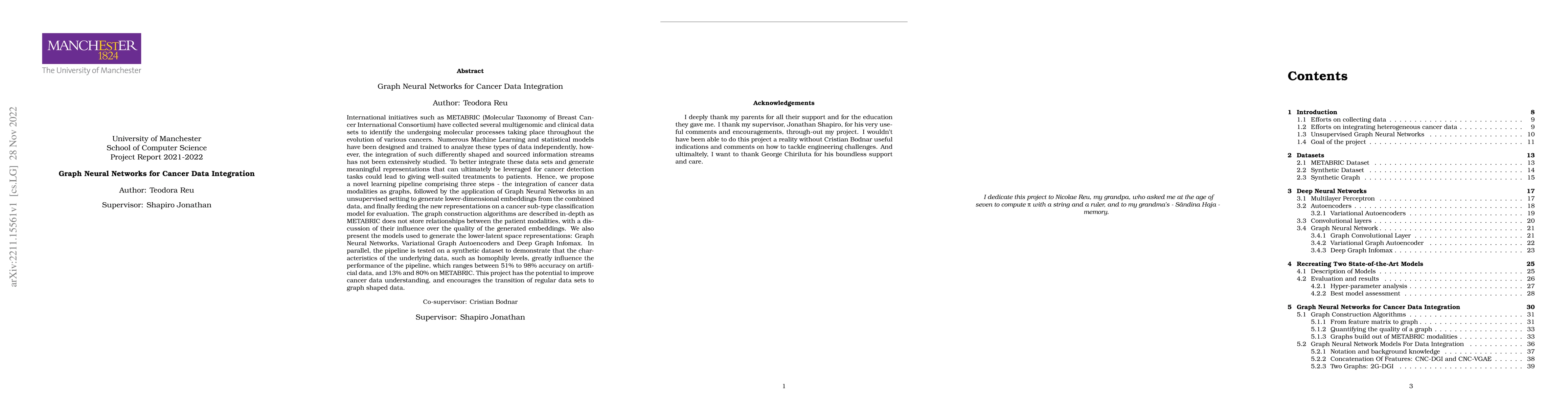 International initiatives such as METABRIC (Molecular Taxonomy of Breast Cancer International Consortium) have collected several multigenomic and clinical data sets to identify the undergoing molecular processes taking place throughout the evolution of various cancers. Numerous Machine Learning and statistical models have been designed and trained to analyze these types of data independently, however, the integration of such differently shaped and sourced information streams has not been extensively studied. To better integrate these data sets and generate meaningful representations that can ultimately be leveraged for cancer detection tasks could lead to giving well-suited treatments to patients. Hence, we propose a novel learning pipeline comprising three steps - the integration of cancer data modalities as graphs, followed by the application of Graph Neural Networks in an unsupervised setting to generate lower-dimensional embeddings from the combined data, and finally feeding the new representations on a cancer sub-type classification model for evaluation. The graph construction algorithms are described in-depth as METABRIC does not store relationships between the patient modalities, with a discussion of their influence over the quality of the generated embeddings. We also present the models used to generate the lower-latent space representations: Graph Neural Networks, Variational Graph Autoencoders and Deep Graph Infomax. In parallel, the pipeline is tested on a synthetic dataset to demonstrate that the characteristics of the underlying data, such as homophily levels, greatly influence the performance of the pipeline, which ranges between 51\% to 98\% accuracy on artificial data, and 13\% and 80\% on METABRIC. This project has the potential to improve cancer data understanding and encourages the transition of regular data sets to graph-shaped data.