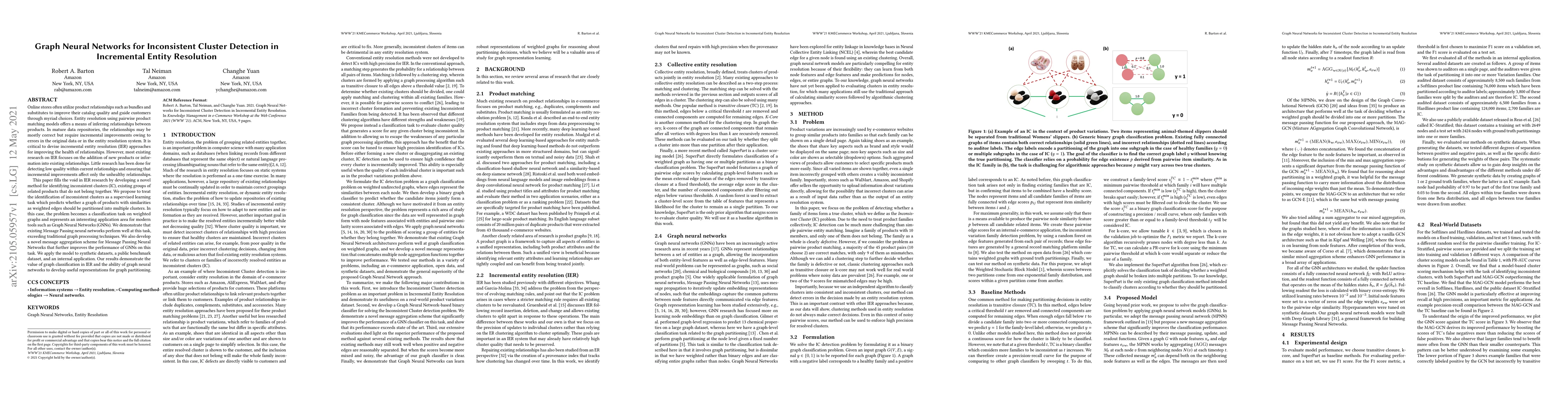 Online stores often utilize product relationships such as bundles and substitutes to improve their catalog quality and guide customers through myriad choices. Entity resolution using pairwise product matching models offers a means of inferring relationships between products. In mature data repositories, the relationships may be mostly correct but require incremental improvements owing to errors in the original data or in the entity resolution system. It is critical to devise incremental entity resolution (IER) approaches for improving the health of relationships. However, most existing research on IER focuses on the addition of new products or information into existing relationships. Relatively little research has been done for detecting low quality within current relationships. This paper proposes a novel method for identifying inconsistent clusters (IC), existing groups of related products that do not belong together. We propose to treat the identification of inconsistent clusters as a supervised learning task which predicts whether a graph of products with similarities as weighted edges should be partitioned into multiple clusters. In this case, the problem becomes a classification task on weighted graphs and represents an interesting application area for modern tools such as Graph Neural Networks (GNNs). We demonstrate that existing Message Passing neural networks perform well at this task, exceeding traditional graph processing techniques. We also develop a novel message aggregation scheme for Message Passing Neural Networks that further improves the performance of GNNs on this task. We apply the model to synthetic datasets, a public benchmark dataset, and an internal application. Our results demonstrate the value of graph classification in IER and the ability of graph neural networks to develop useful representations for graph partitioning.