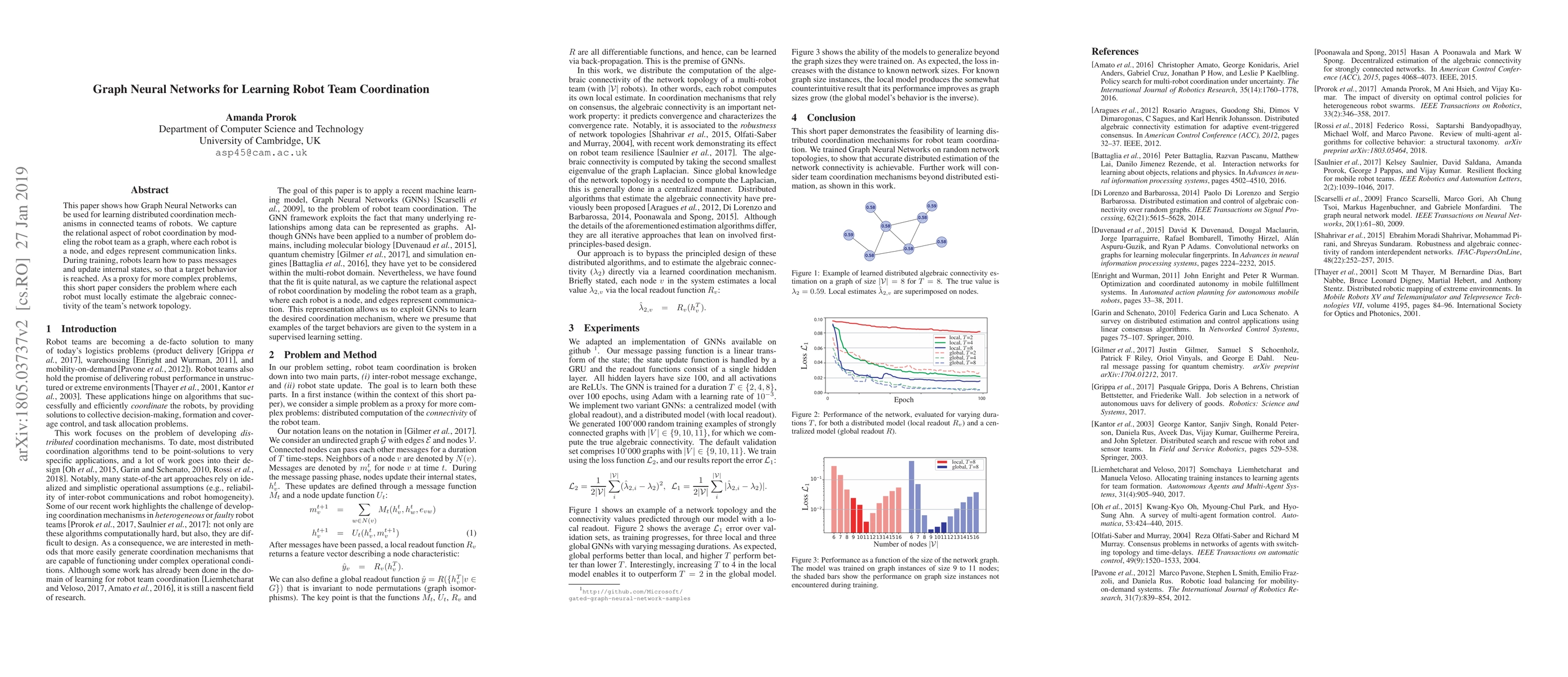 This paper explores the use of Graph Neural Networks to learn distributed coordination in teams of robots, modeling the team as a graph where nodes represent robots and edges represent communication links. The robots learn to pass messages and update states to estimate the algebraic connectivity of the network topology.