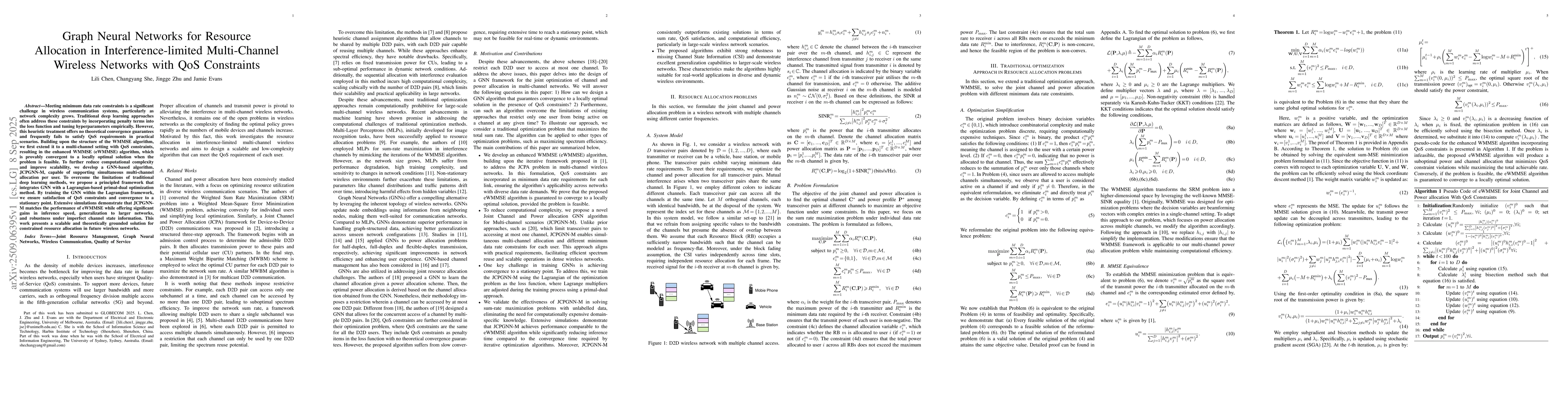 Meeting minimum data rate constraints is a significant challenge in wireless communication systems, particularly as network complexity grows. Traditional deep learning approaches often address these constraints by incorporating penalty terms into the loss function and tuning hyperparameters empirically. However, this heuristic treatment offers no theoretical convergence guarantees and frequently fails to satisfy QoS requirements in practical scenarios. Building upon the structure of the WMMSE algorithm, we first extend it to a multi-channel setting with QoS constraints, resulting in the enhanced WMMSE (eWMMSE) algorithm, which is provably convergent to a locally optimal solution when the problem is feasible. To further reduce computational complexity and improve scalability, we develop a GNN-based algorithm, JCPGNN-M, capable of supporting simultaneous multi-channel allocation per user. To overcome the limitations of traditional deep learning methods, we propose a principled framework that integrates GNN with a Lagrangian-based primal-dual optimization method. By training the GNN within the Lagrangian framework, we ensure satisfaction of QoS constraints and convergence to a stationary point. Extensive simulations demonstrate that JCPGNN-M matches the performance of eWMMSE while offering significant gains in inference speed, generalization to larger networks, and robustness under imperfect channel state information. This work presents a scalable and theoretically grounded solution for constrained resource allocation in future wireless networks.