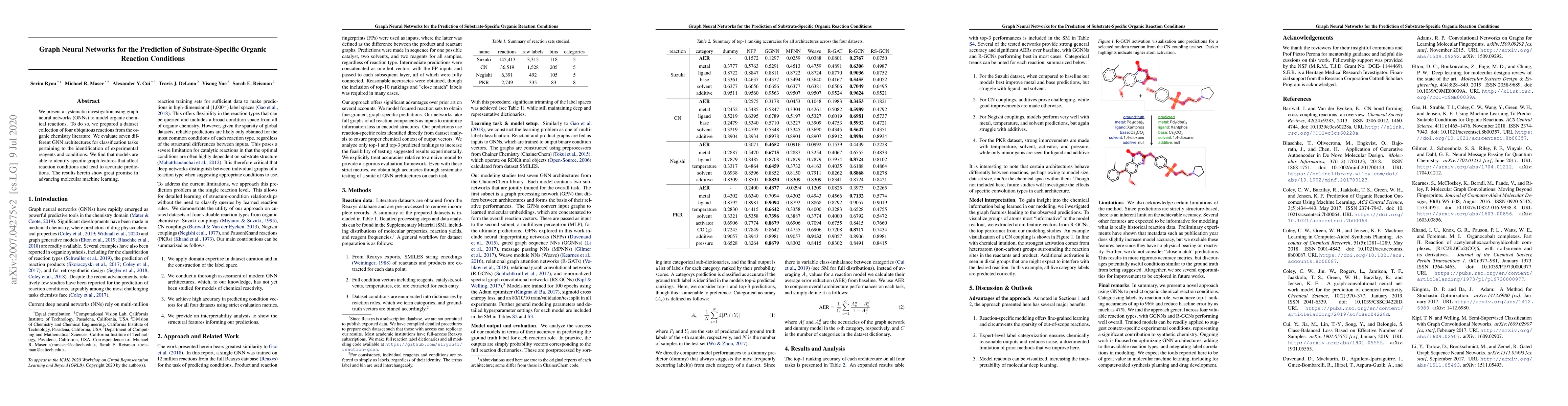 This research employs graph neural networks (GNNs) to predict substrate-specific organic reaction conditions, evaluating seven GNN architectures on a dataset of four common organic reactions. The study finds that GNNs can accurately identify relevant graph features, demonstrating potential for advancing molecular machine learning.